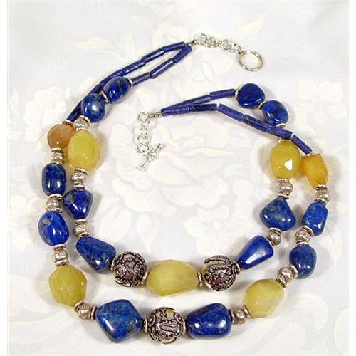 MASSIVE Double LAPIS Chalcedony Gemstone Necklace... The necklace has measurements of 17" in length with the sterling OM center beads measuring 17mm and for those not familiar with metric 25mm=1". The gram weight is 163. Guaranteed to be the finest of natural gemstones complimented with tribal sterling....