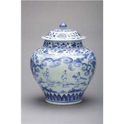 Massive and very finely detailed, Chinese early Ming Dynasty, Hsuan Te Period, blue and white porcelain jar and cover with "windswept" scholars and attendants in landscape motif (retouching on luting line and interior firing flaws, repaired chips to cover), 15th Century; H: 19"
