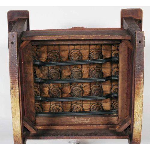 MASSIVE ARTS & CRAFTS OAK ROCKER attributed to Stickley Bros. 34 1/2" wide, 33" high, 29" deep, original finish circa 1910 CONDITION REPORT: no damage or restoration, normal arm wear, cushion as-is, some crusty black residue on back.