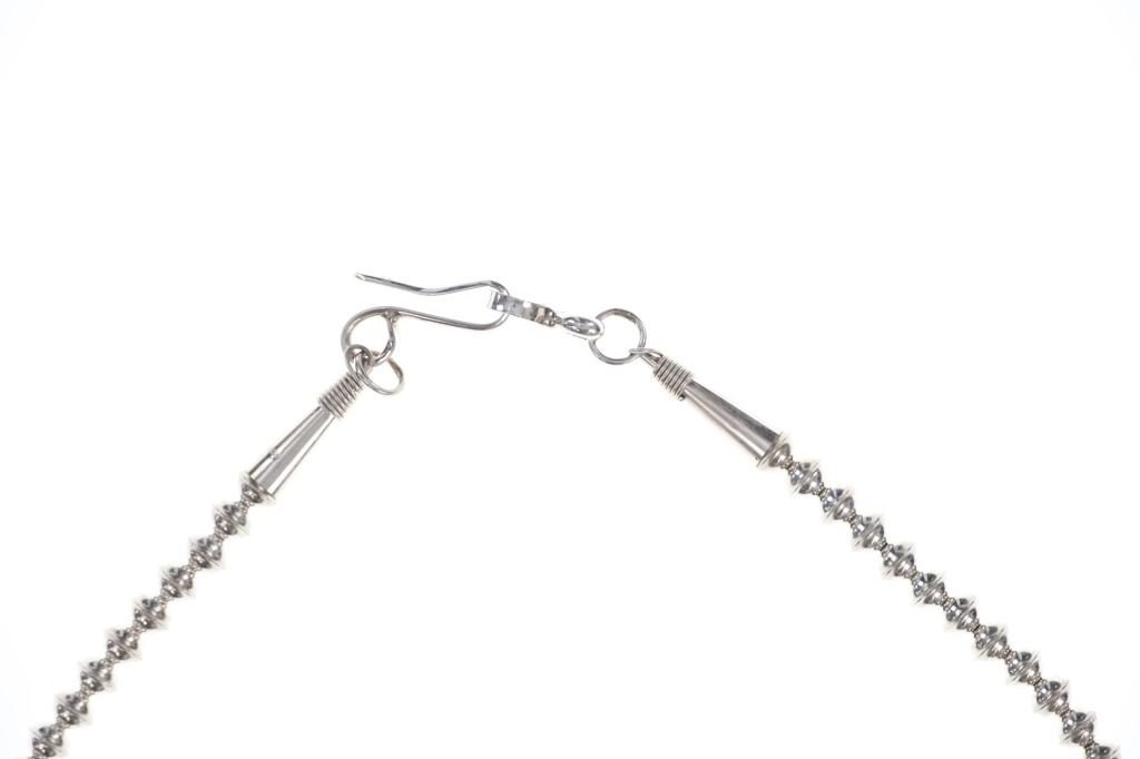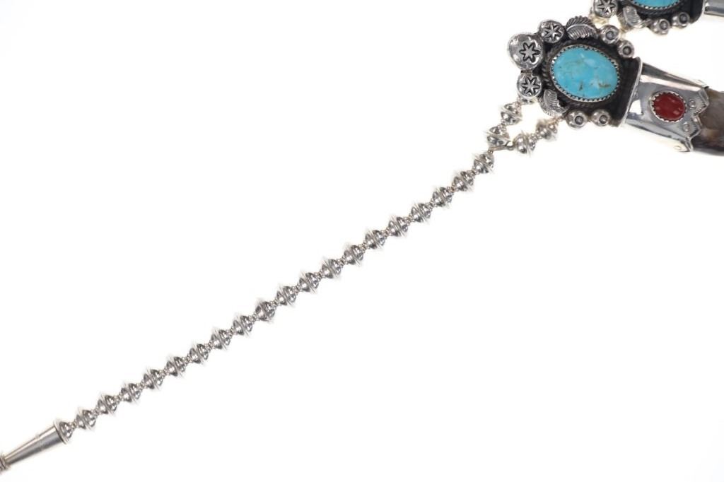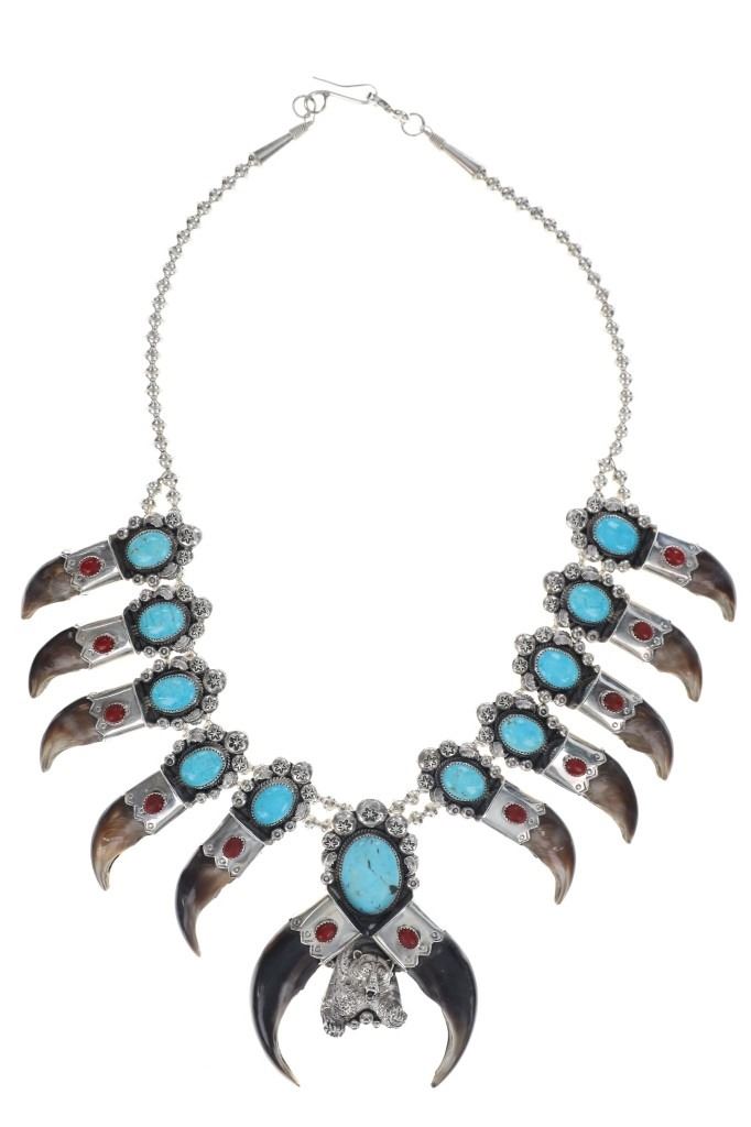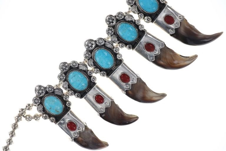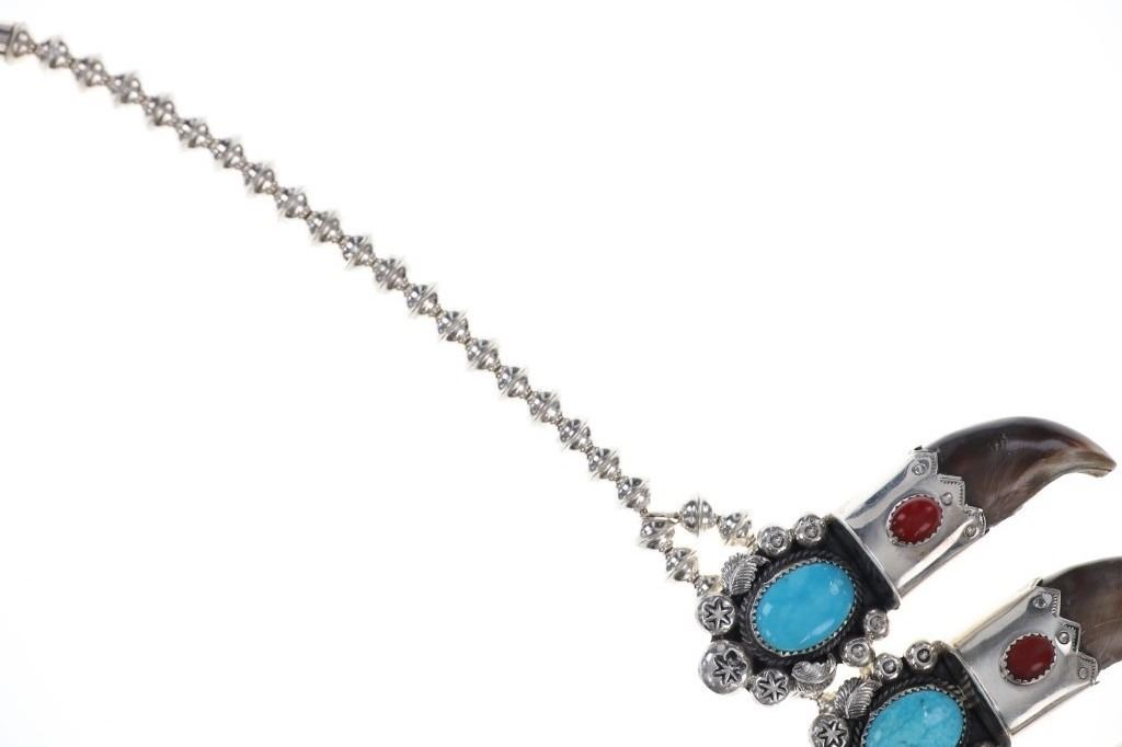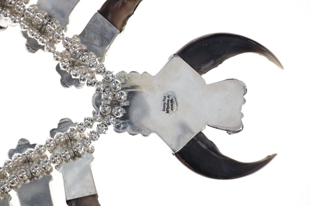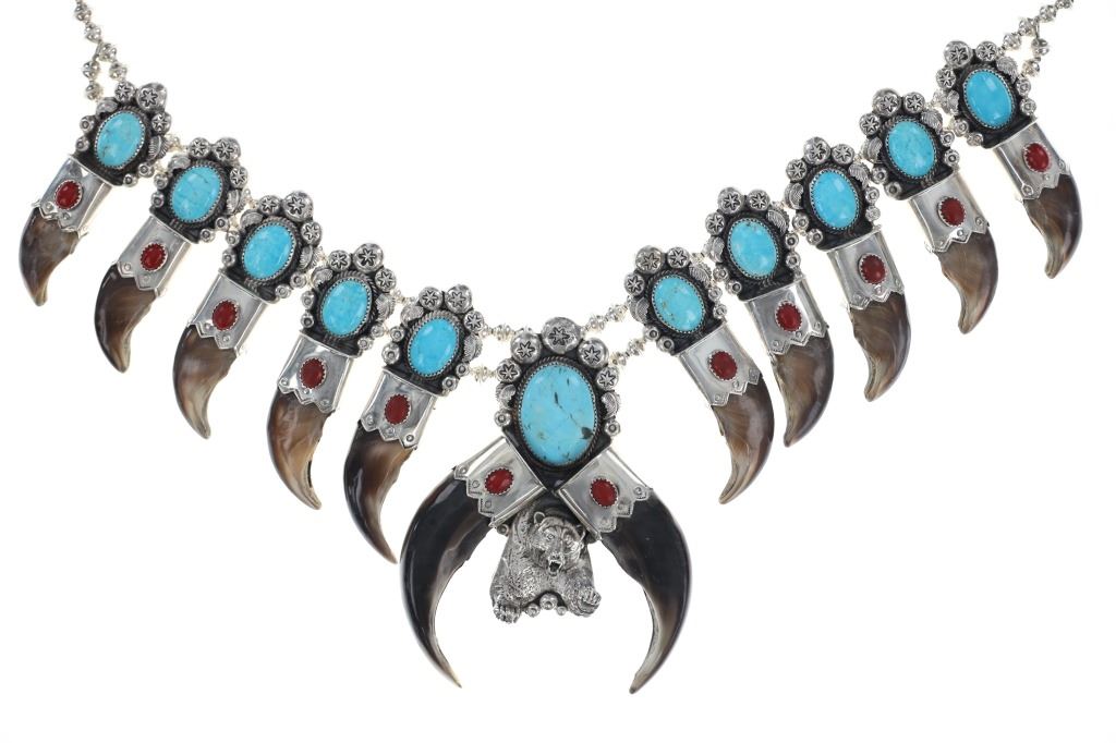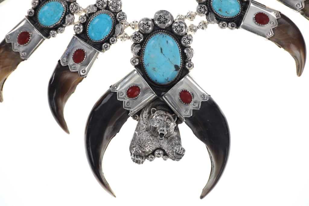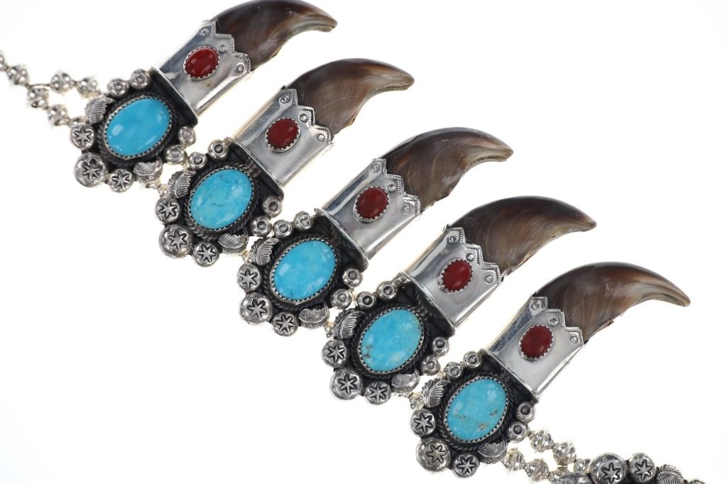This is a phenomenal and massive Alaskan Brown Bear Claw squash blossom sterling silver necklace set with Kingman Turquoise and Oxblood Coral with a fantastic sterling Grizzly / Brown Bear effigy by renowned Navajo silversmith Kenny Ray McNeilley Jr. This is one of the larger squash blossoms offered and is signed on the back of the massive naja squash pendant, “Kenny Ray McNeilley Jr. STERLING”. The piece exhibits heavy sterling silver work with the naja showing a dimensional Grizzly Bear / Brown Bear effigy cast from sterling silver set between two polished Alaskan Brown Bear massive front claws set in sterling silver with Oxblood Branch Coral cabochons above with a large polished cabochon of Kingman mine turquoise above with heavy large old pawn pattern stamped thick sterling spots and feather designs. The necklace is strung on a double strand of sterling silver Navajo Pearl concho beads on sterling silver chain. There are ten blossoms with ten polished back claws from an Alaskan Brown Bear in a matching Kingman Turquoise, Oxblood Coral and heavy sterling silver pattern. One of the best Brown Bear Claw Navajo Squash Blossom Necklaces offered for sale. Navajo silversmith Kenny Ray McNeilley Jr. is known for his massive bear claw necklaces such as the piece, similar to this example, which had been previously valued at galleries for upwards of $30,000. The necklace measures 28.25-inches long end to end. The naja is about 4.75-inches long by 3.5-inches wide. Visible claws on the naja are at least 3-inches long each. Total weight of 377.8 grams.