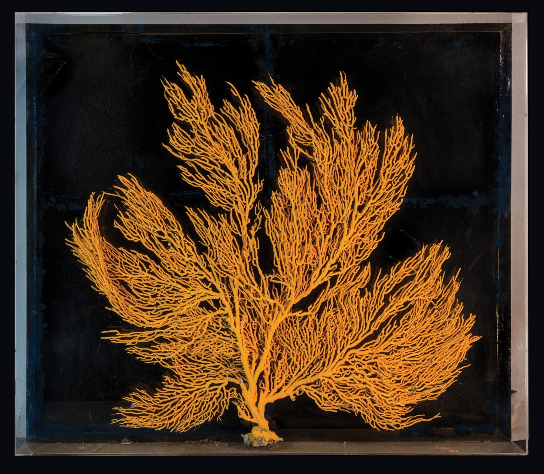 (1960s) This very rare, and now illegal to obtain from the ocean, sea fan coral display came right out of Don the Beachcomber in Las Vegas when they closed operations. Oceanic Arts made a deal with the company to buy out all their decor which OA did and has slowly sold off over the years. Comes in its original lucite display case from the restaurant. Fragile and large. Special shipping considerations. 31.25"x36.25". VG+ with typical wear from use. Some cracking in the plexi display although the coral is in excellent condition.