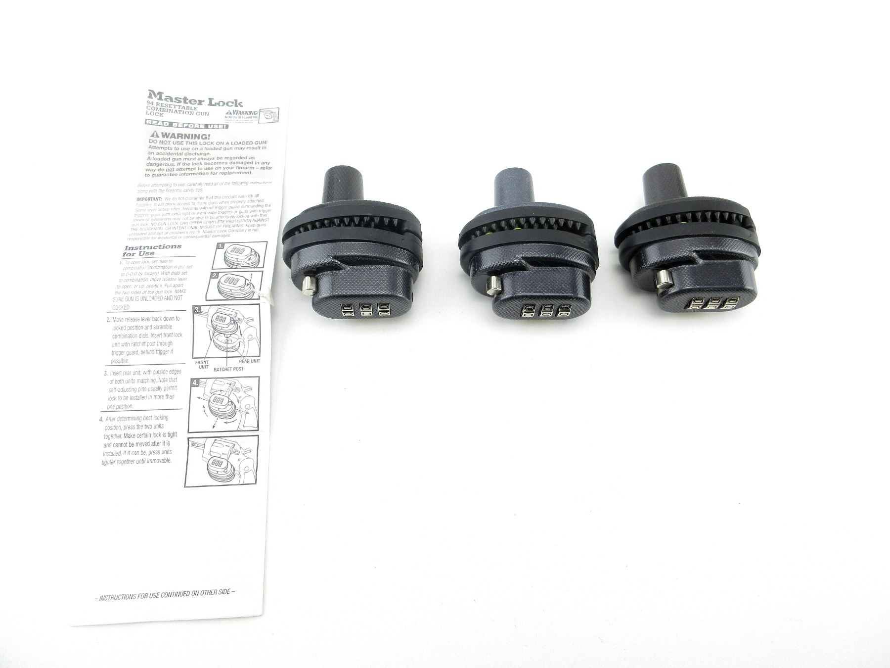 LOT INCLUDES; (3) MASTER COMBINATION LOCK, WITH INSTRUCTIONS. SEE PHOTOS.