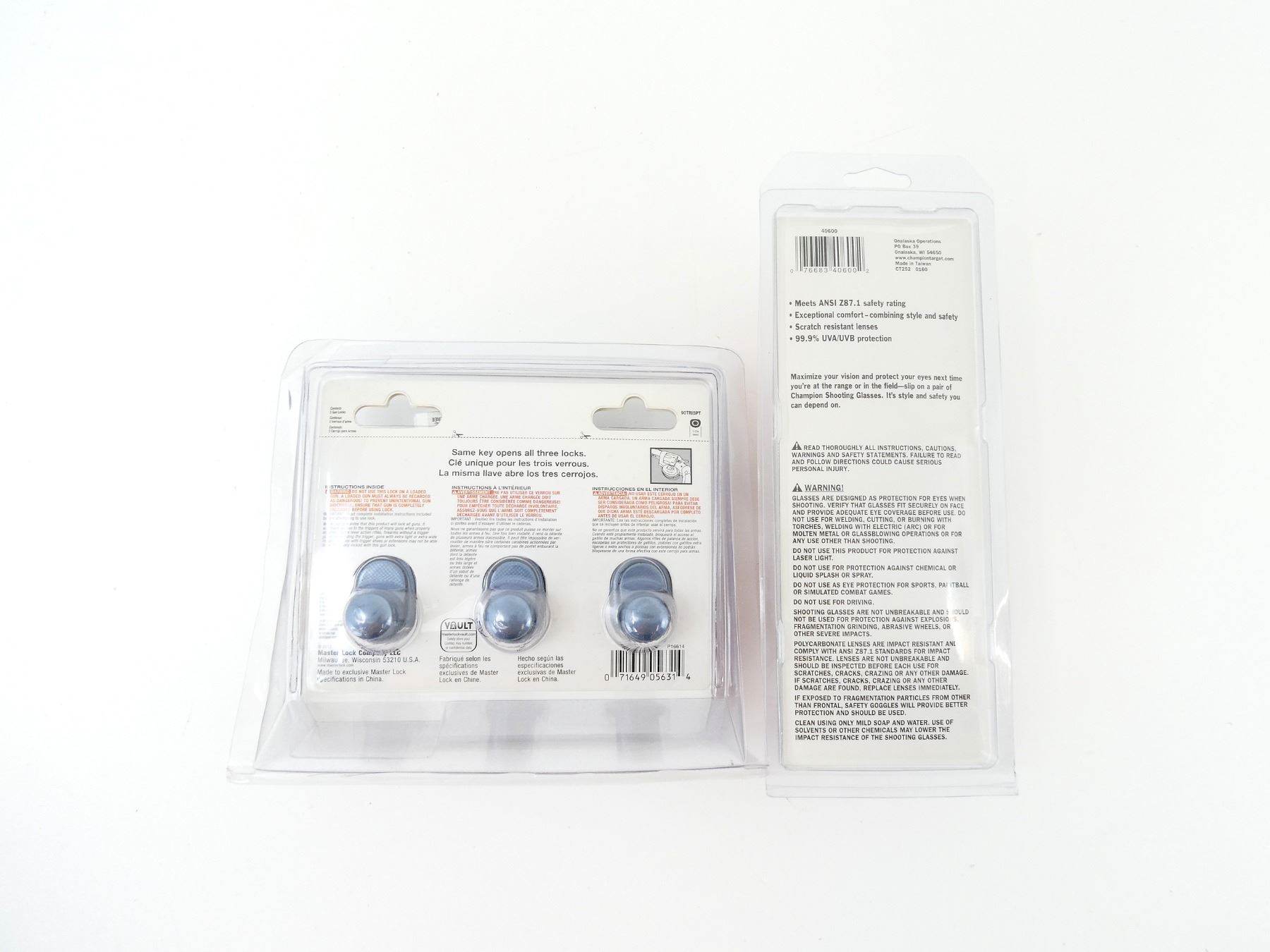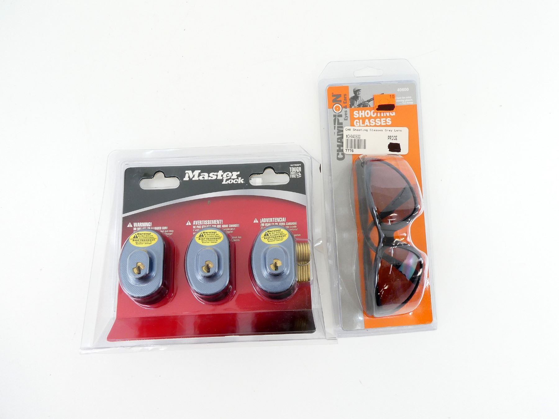 LOT INCLUDES; (1) PACKAGE OF THREE MASTER KEYED TRIGGER LOCKS WITH KEYS, NOS IN ORIGINAL PACKAGING & (1) PAIR OF CHAMPION SHOOTING GLASSES, PART #: 40600, NOS IN ORIGINAL PACKAGING. SEE PHOTOS.