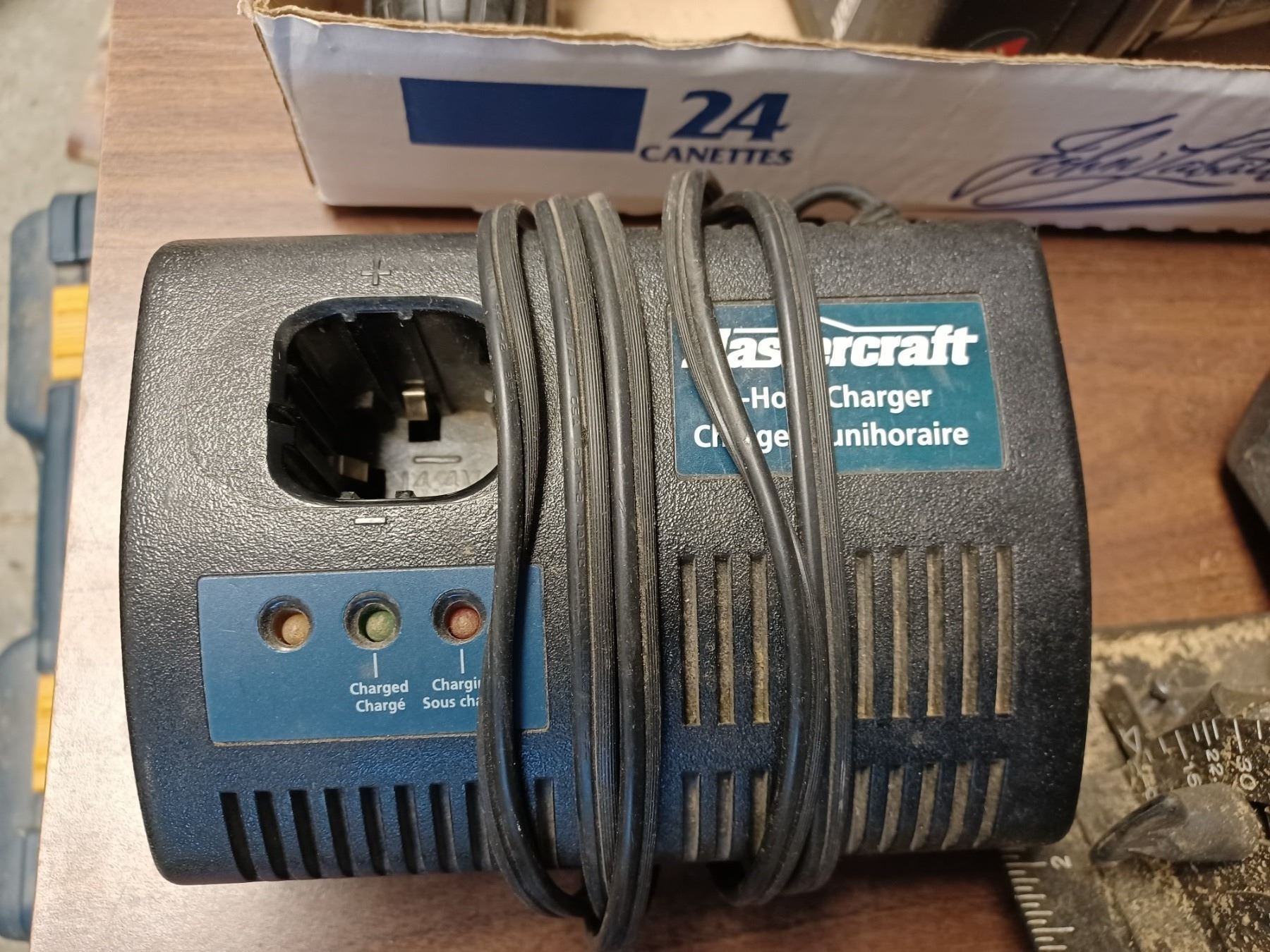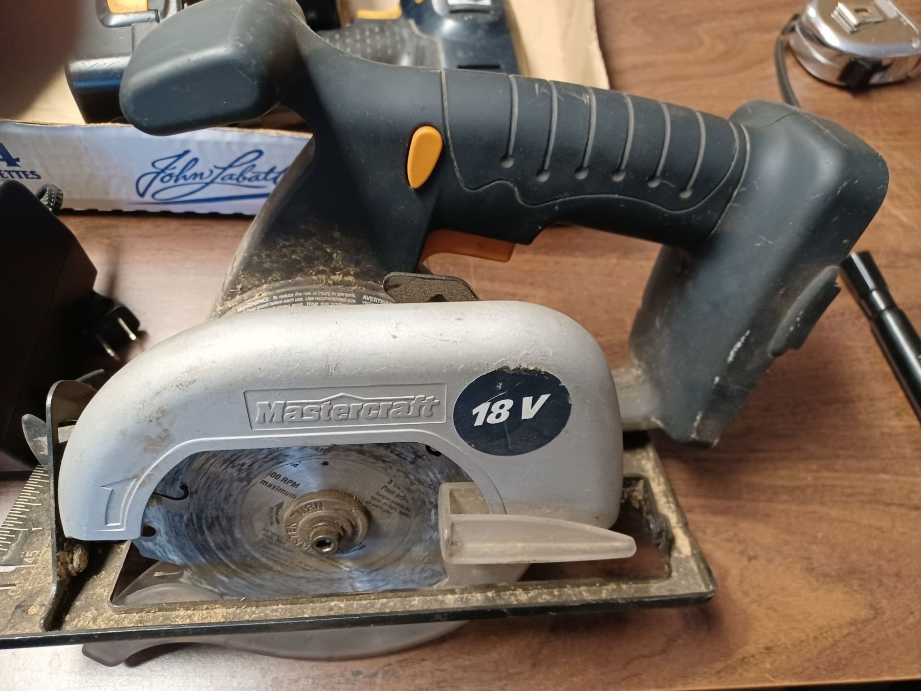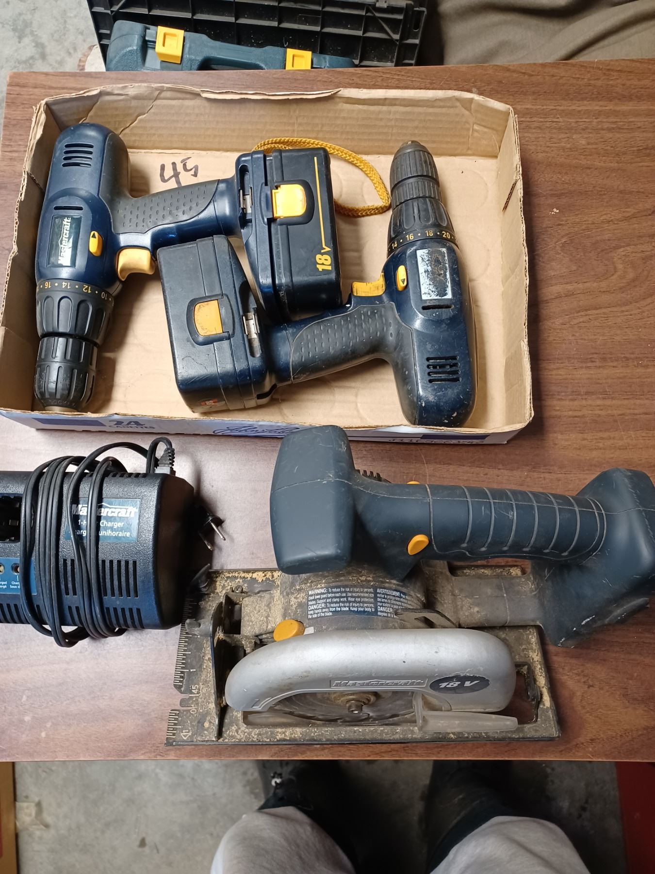 MASTERCRAFT 14.4V CIRCULAR SAW, TWO DRILLS, TWO HD BATTERIES AND CHARGER - ALL WORKING