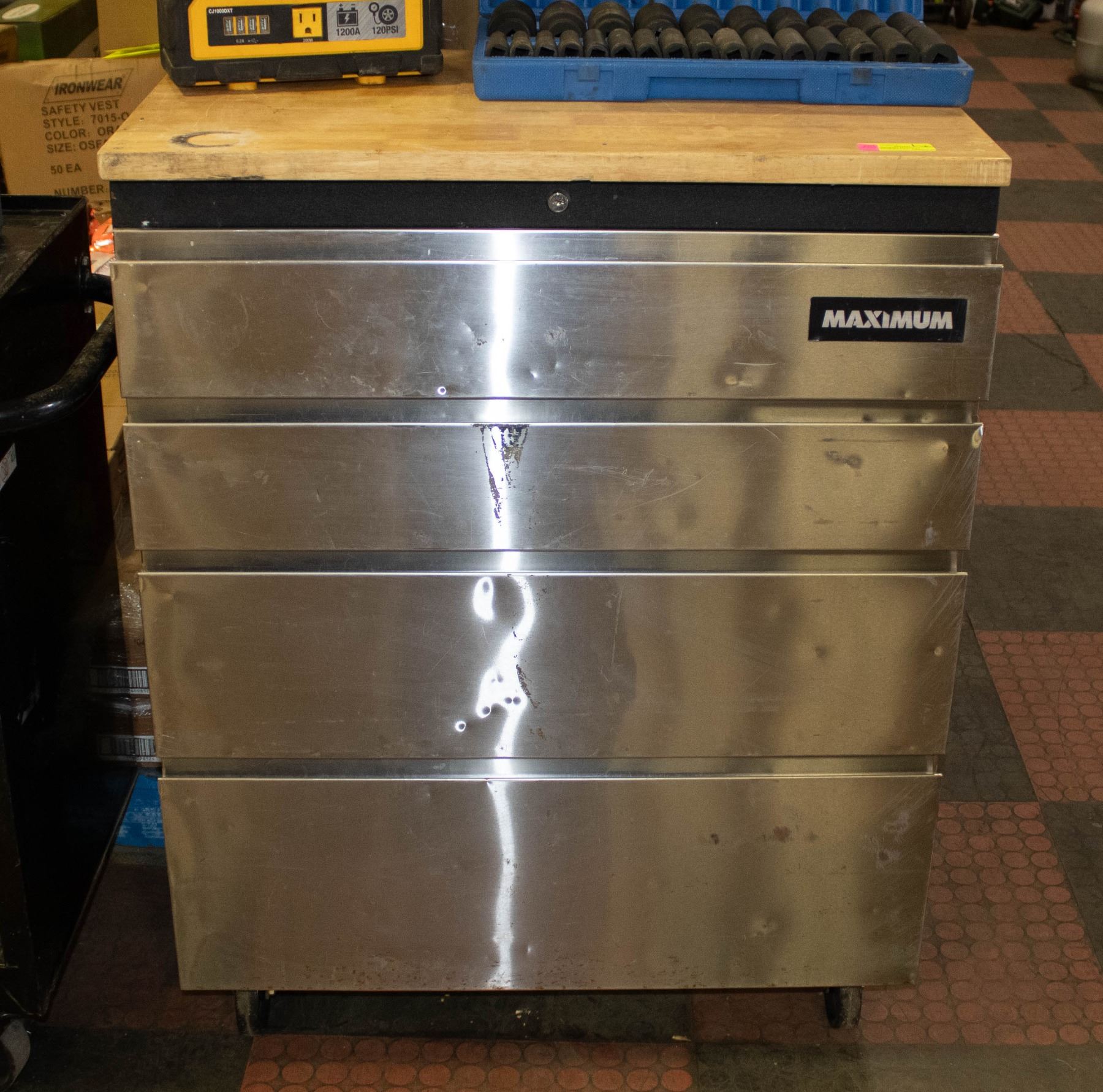 BOX WITH WOOD BENCH WORK TOP (30.5"L X 18.5"W X 39.75"H) - 4 LARGE ROLLOUT ALL METAL DRAWERS WITH STAINLESS STEEL DRAWER FRONTS, 1"-THICK WOOD WORK TOP **ALL ITEMS MUST BE REMOVED BY 5PM SATURDAY, APRIL 12TH 2025. ALL REMAINING ITEMS WILL BE SUBJECT TO A $6.00 PER DAY STORAGE CHARGE. ANY ITEMS REMAINING AFTER MONDAY, APRIL 28TH 2025 WILL BE CONSIDERED FORFEITED. NO REFUNDS WILL BE ISSUED FOR FORFEITED ITEMS. TO SCHEDULE A PICK UP APPOINTMENT CLICK HERE