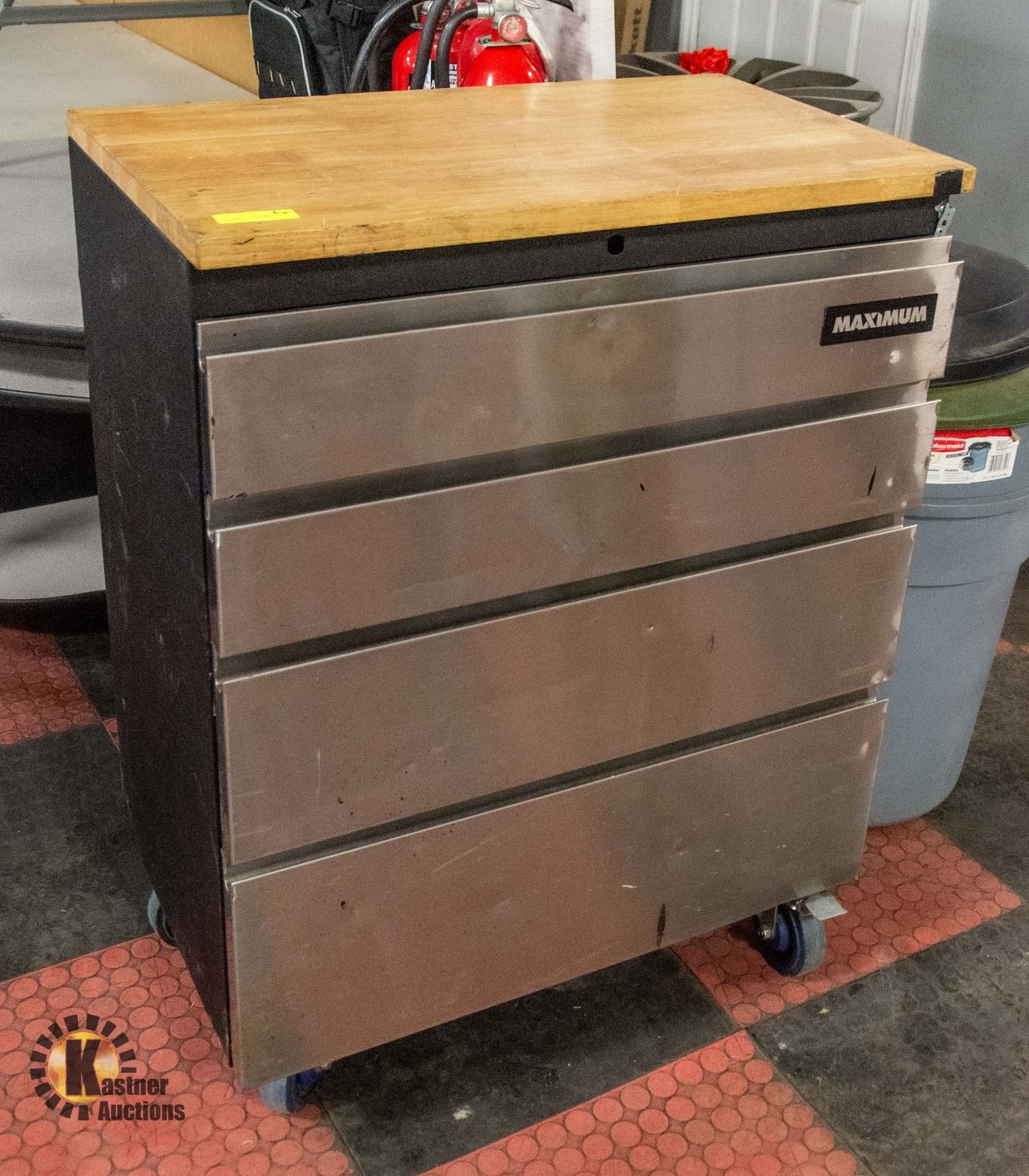 4-DRAWER TOOL STORAGE SYSTEM WITH SOLID WOOD WORKBENCH TOP (30.5"L X 18.5"W X 41"H) - ALL STEEL BOX WITH STAINLESS STEEL DRAWER FRONTS **ALL ITEMS MUST BE REMOVED BY 5PM SATURDAY, FEBRUARY 8TH 2025. ALL REMAINING ITEMS WILL BE SUBJECT TO A $6.00 PER DAY STORAGE CHARGE. ANY ITEMS REMAINING AFTER MONDAY, MARCH 3RD 2025 WILL BE CONSIDERED FORFEITED. NO REFUNDS WILL BE ISSUED FOR FORFEITED ITEMS. TO SCHEDULE A PICK UP APPOINTMENT CLICK HERE