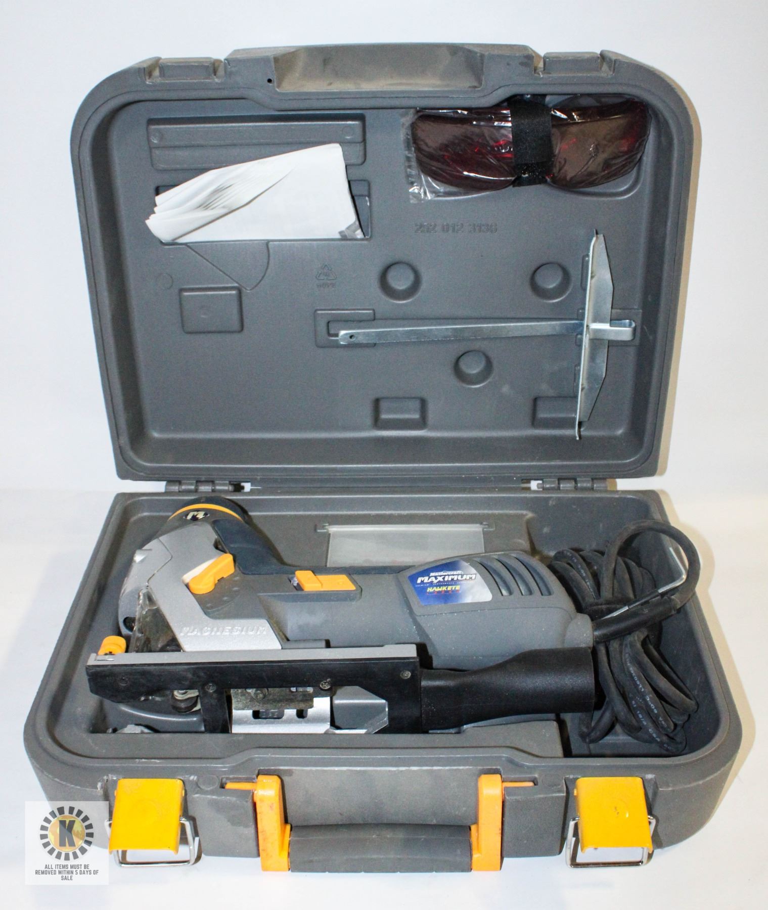 QUALITY BARREL GRIP JIG SAW WITH HAWKEYE LASER IN CASE WITH BLADES, INSTRUCTIONS, LASER GLASSES (MSRP-$169.99) - WORKING **ALL ITEMS MUST BE REMOVED BY 5PM SATURDAY, APRIL 5TH 2025. ALL REMAINING ITEMS WILL BE SUBJECT TO A $6.00 PER DAY STORAGE CHARGE. ANY ITEMS REMAINING AFTER MONDAY, APRIL 21ST 2025 WILL BE CONSIDERED FORFEITED. NO REFUNDS WILL BE ISSUED FOR FORFEITED ITEMS. TO SCHEDULE A PICK UP APPOINTMENT CLICK HERE