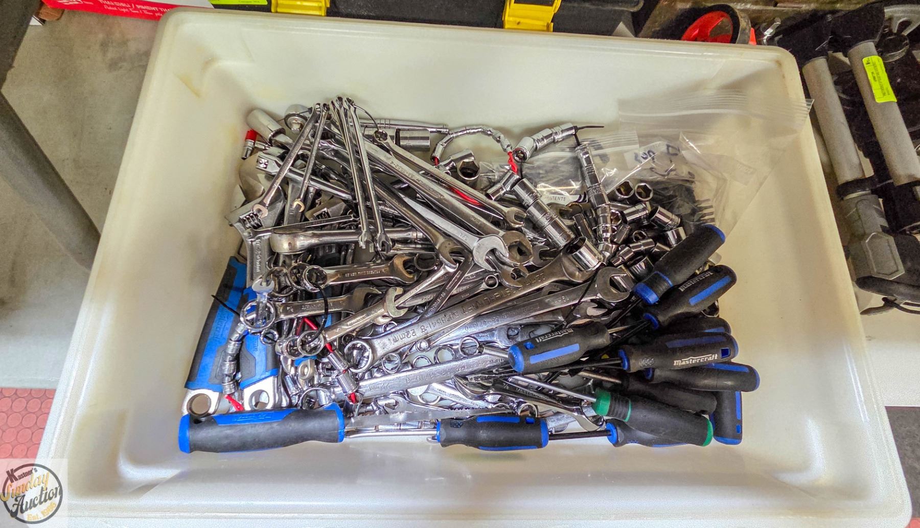 WRENCHES, RATCHETS, EXTENSIONS, SOCKETS, ASSORTED WRENCHES IN TOTE **ALL ITEMS MUST BE REMOVED BY 5PM SATURDAY, MAY 24TH 2025. ALL REMAINING ITEMS WILL BE SUBJECT TO A $6.00 PER DAY STORAGE CHARGE. ANY ITEMS REMAINING AFTER MONDAY, JUNE 9TH 2025 WILL BE CONSIDERED FORFEITED. NO REFUNDS WILL BE ISSUED FOR FORFEITED ITEMS. TO SCHEDULE A PICK UP APPOINTMENT CLICK HERE