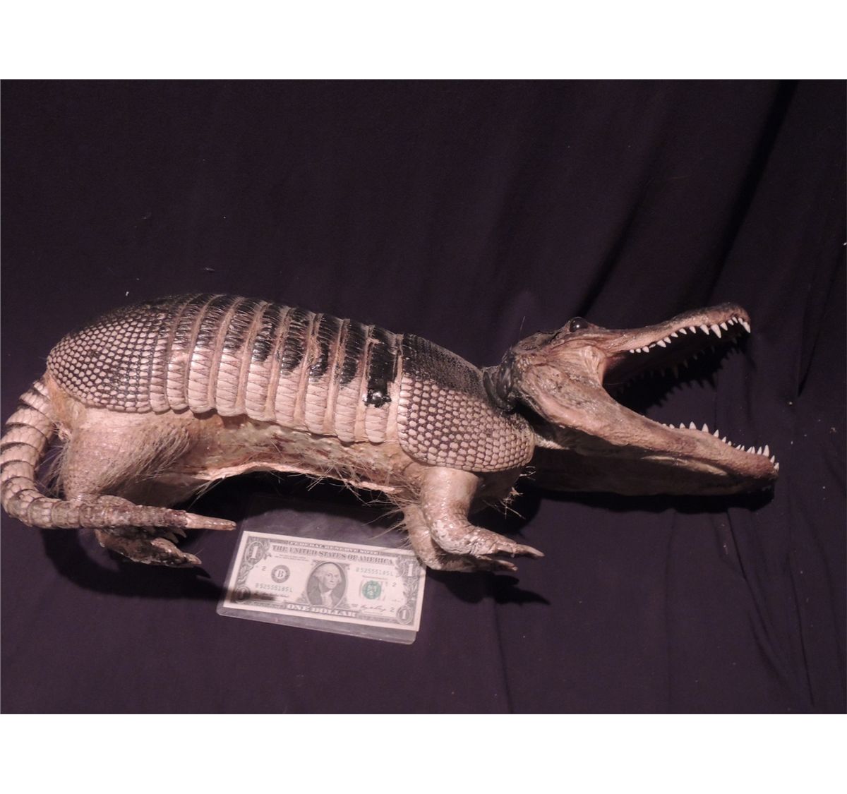 This is a very cool one of a kind armadillo with an alligator head. I think this is from THE MASTERS OF HORROR TV series. Professionally made by world famous taxidermist of Hollywood, Bischoff's.