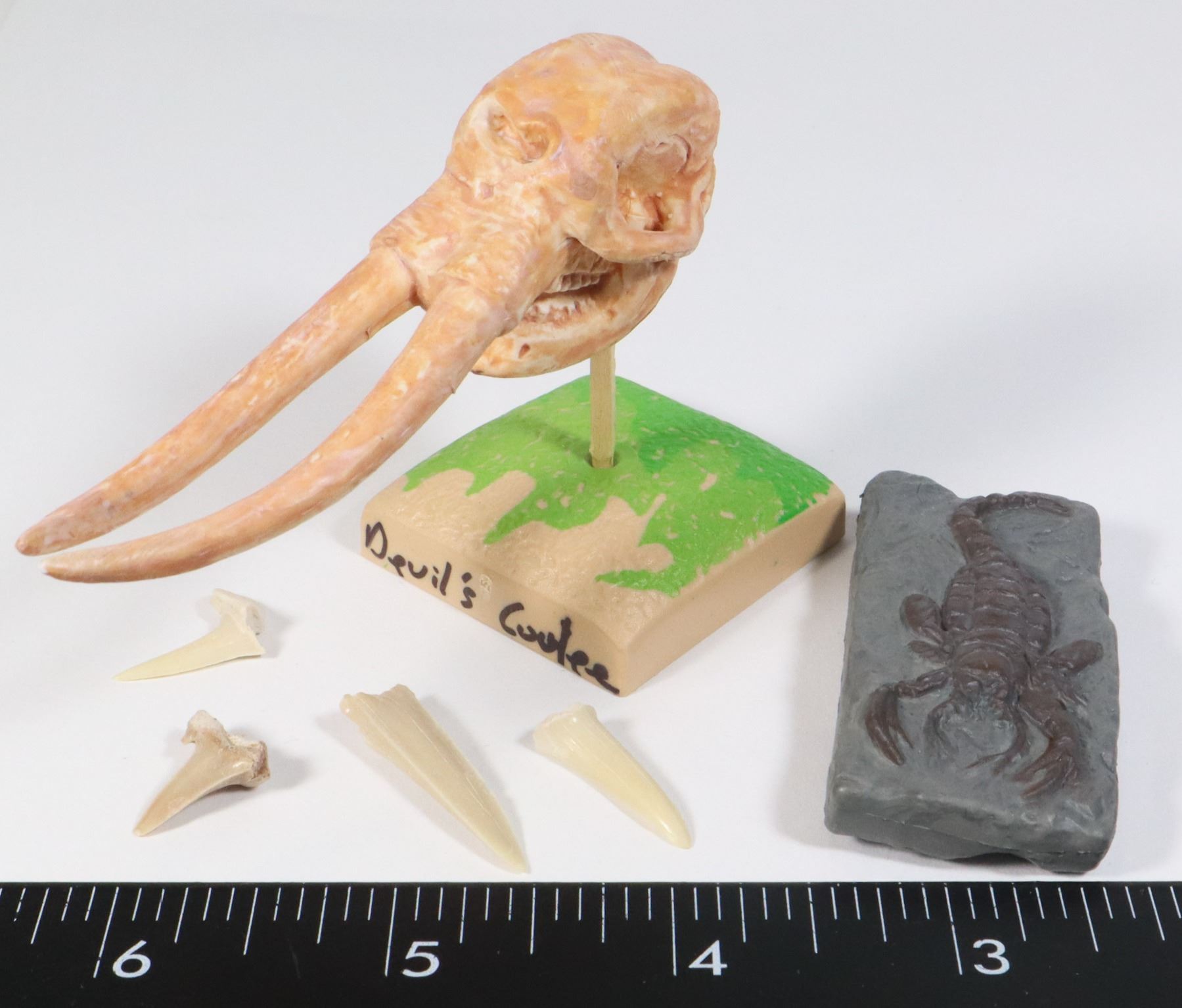 STAND, PLASTIC FOSSIL AND FOUR AUTHENTIC SHARKS TEETH***ITEM(S) LOCATED IN LETHBRIDGE ALBERTA. ALL ITEMS IN THIS AUCTION ARE ELIGIBLE FOR FREE TRANSPORT TO EDMONTON. EXPECT 1 TO 3 WEEK WAIT FOR ITEMS TO ARRIVE IN EDMONTON. WORLDWIDE SHIPPING THROUGH CANADA POST AVAILABLE