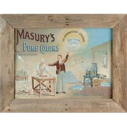 MASURY’S PAINT TIN SIGN. Illustration of pigment preparation and canning process for the John W. Masury & Son Paint Company of New York and Chicago. Lithographed by Sentenne & Green, New York. SIZE: Image size: 23 1/4” w. x 17” h. CONDITION: A few dents with some light surface wear and scuffing, otherwise good condition. PF 1-4477 (300-500)