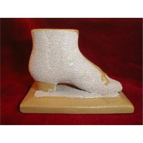 <p>An Anton Tschinkel yellow ware or Drab Ware shoe with white salt glaze or sand finish. The strikers are around the edge of the base. Molded laces down the front with