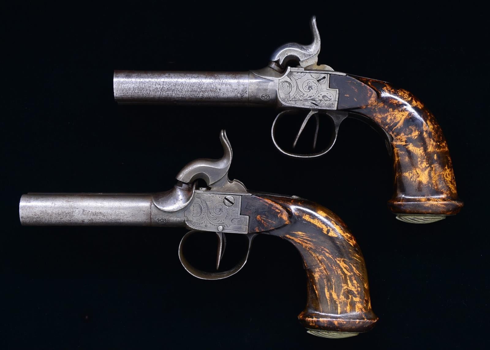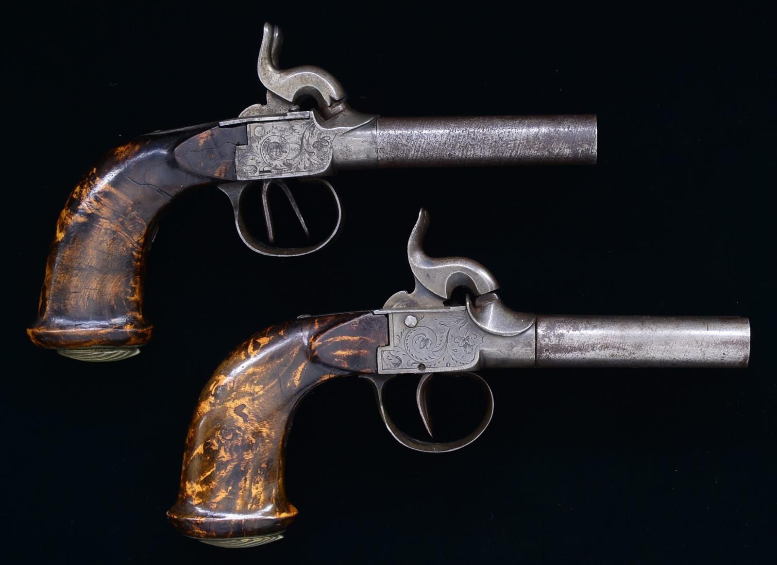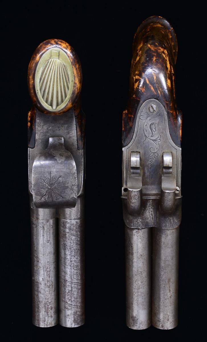 BOTH: cal. 50. NSN. 3 1/2" Twist steel screw bbls. Iron boxlock actions w/ dbl. center mounted hammers & triggers. Actions have foliate scroll engraving on sides & top strap. Hardwood stocks have burl grained appearance w/ flared butts having German silver clam shell trapdoor compartments. 1) Smooth bores. CONDITION: metal has cleaned gray appearance showing scattered light corrosion. Action is missing right top strap screw. Right bbl. has slight gap at frame. Bores show scattered light pitting. Functioning action. Grips show light wear w/ scattered scratches & marks. Nipples shows distortion from dry firing. (01-19127/DS). 2) Bores have fine multi groove shallow rifling. CONDITION: cleaned gray metal showing scattered light pitting. Action top strap has gap on right side. Functioning action w/ heavy trigger pulls. Bores retain sound rifling. Grips show light wear w/ grain checks on right side. (01-19128/DS). BOTH ANTIQUE. $400-600.