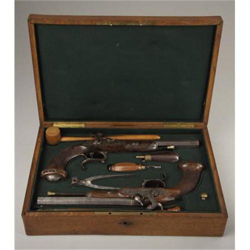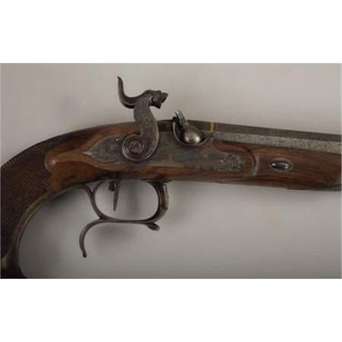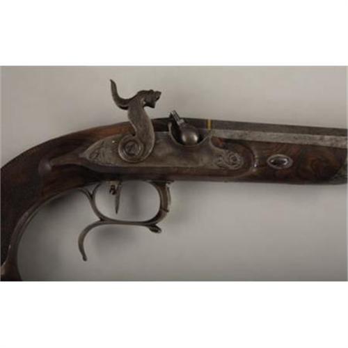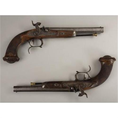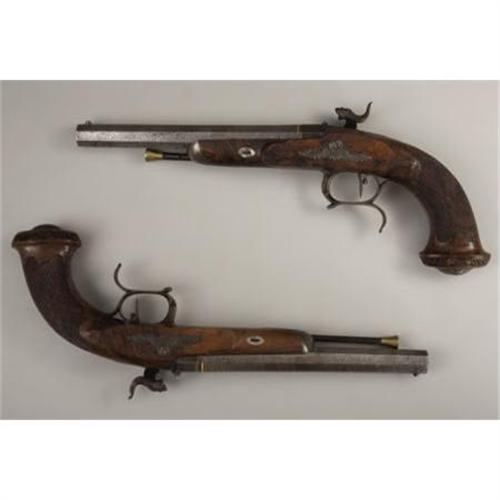 <B>MATCHED PAIR OF CASED PERCUSSION DUELING PISTOLS.</B></I> These pistols are of extra quality, beautifully engraved and stocked. It's interesting a pair of pistols of this quality do not bear any makers identification or proof marks. Physical characteristics of construction, however, indicate they are of Belgian or possibly French origin. All mountings are of iron. Pistols are fitted with sighted 8” Damascus, octagon, micro grooved barrels in .56 calibre. Breaches are of the patented design with brass washered nipples. Top tangs and accompanying screws are delicately engraved in a floral pattern terminating in a chrysanthemum. Lock plates tell a story. One lock plate is beautifully engraved behind the hammer with a seated hound in an outdoor setting. The other lock plate is engraved with a reclining fox, again in an outdoor setting. Vine and foliage engraving adorns the front portion of the locks. Hammers are fantastic with great sculptural form and engraving. Stylized chisel relief fanged lion heads adorn hammer top and faces. In addition to vine and foliage engraving on the hammers, one is engraved with a delicately formed crane. The other hammer has a duck afloat in a pond. Lock escutcheons are eloquently formed and engraved with winged gargoyle heads. Trigger guards protecting the set triggers are finger spurred. Both are engraved, keeping with the outdoor theme evident throughout the engraving layout, with shore birds and water fowl. Steel trigger plates are sculptured retaining the foliage engraving style. Centralized ovals in each trigger plate contain an outdoor scene of a dwelling on a hill and a goose, respectively. Ramrod caps are delicately engraved with flower filled urns. Iron butt caps are raised and surmounted with large flowers. Half stocks of burl wood are checkered at the grip. Termination of stocks at butt are flared and carved. Brass tipped ebony ramrods are a bit wormy on ebony portion. Small gold ovals are inlayed in stocks at top of wrists. Cased accessories include an unmarked flask, loading mallet, mold, screw driver, long ball seat and cleaning rod. Numerous cast balls are in the French style fitted case. These pistols, sometime during their existence, became separated from their original casing. The pistols and their accessories are currently housed in a casing that appears to be about 50 or so years old. They display very well in this green lined, French style casing.<BR><BR><B>Condition:</B></I> Locks, hammers and patent breaches retain about 80% of their original case hardening color. Trigger guards have naturally faded on the outside, but retain about 80% of their case hardening on the inside bows. Damascus barrels are light grey in patina. Strong amounts of blue are evident on the trigger plates and top tang. Balance of exposed metal has faded to a pleasing uncleaned patina. Burl wood stocks about perfect with only minor wear and handling abrasions. All cased accessories are in relative unused condition. Case lining is perfect. Outside of old wood casing has normal handling marks and abrasions.<BR><BR><b>Shipping:</b> Miscellaneous Collectibles, Smal (<a target="_blank" href="http://www.heritageauctions.com/common/shipping.php">view shipping information</a>)