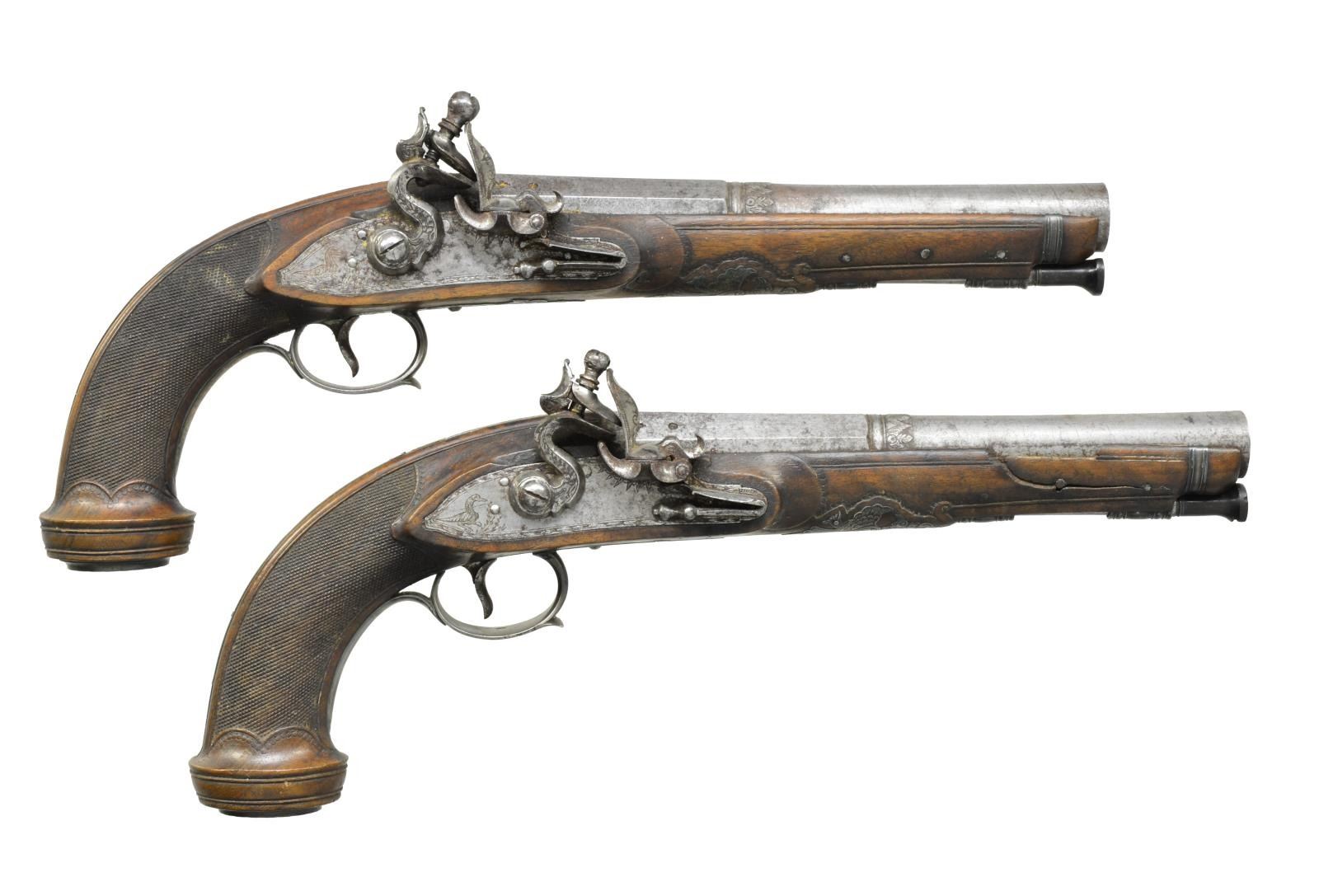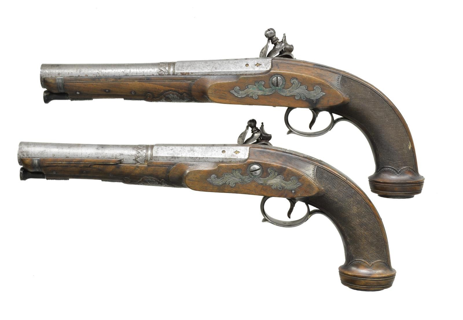 BOTH: cal. about 69. NSN. Bbls. 7 7/8" of smoothbore twist steel having rnd. to oct. configuration w/ floral carved & faceted transitions. Bbl. flats have gold filled fleur de lis markings. Lockplates have borderline engraving w/ bird behind hammers. Ornate sculpted hammers have wolf's head engraving. Pin fastened walnut stocks w/ flared butts. Stocks have moldered borders around ramrod channels, bbl. channels, backstraps, as well as lock & sideplates. Finely checkered wrists have carved borders w/ punch dot highlights. Stock ornamentation includes hand checkering w/ fancy borders. German silver fittings & ornamentation consist of pierced dbl. headed eagles on forearm bottoms, fancy finialed trigger guards, buttcaps, sideplates & backstraps that have floral engraving. Iron ramrods have wooden button tips & held by 2 faceted German Silver pipes that match the forearm tip rings. CONDITION: metal parts of both pistols have faded to gray w/ scattered spots of light pitting. German silver fittings have acquired patches of dark patina. Stocks have worn finish. One stock has cracks & chips along both sides of forend. Wood ramrods tips are chipped. Both have sound mechanics. Dark pitted bores. (01-17816(2)/DS). BOTH ANTIQUE. $1,000-1,500.