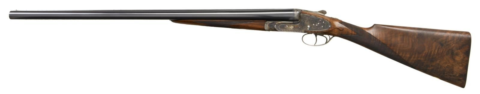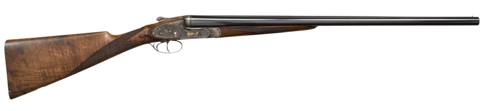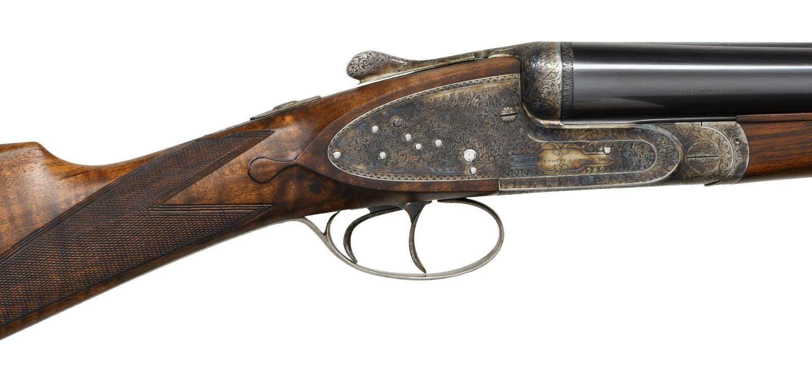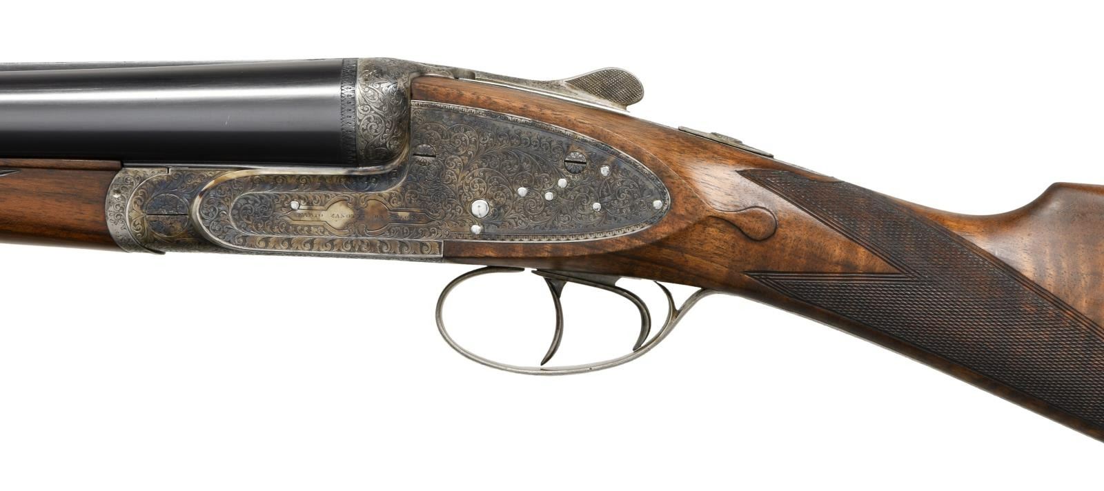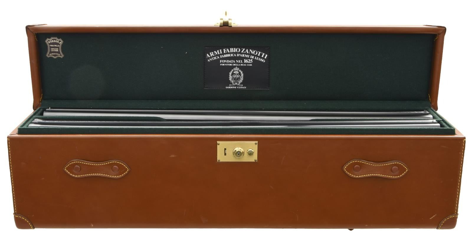 DOUBLE TRIGGER GAME GUNS WITH CASE. Cal. 12 Ga. 2 3/4" (both). S# 5200 & 5201. These good quality handmade guns have 25-1/4" chopper lump barrels fitted with matted Churchill type ribs. Importer "Beretta USA" is on left sides. Rear portions of ribs, top levers and forend tips are gold inlaid with "1" or "2" denoting a true pair. Barrel flats are stamped with S#'s and 1973 Italian nitro proofs. Bottoms of barrels are engraved with information regarding design and commissioning for the building of this pair of guns for Avvocato Ernesto Ferettini. Case hardened sidelock actions feature non-automatic safetys and double triggers, fronts articulated. Actions are engraved with near full coverage very well cut varying size open shaded scroll. Maker's name and address is on each side, bottoms of actions are engraved "HAMMERLESS" "MOD CHURCHILL" "XXV". Trigger plates are signed by engraver "F. Iora 1973" (Ferruccio born in 1924 well known for his scroll and forend inlays). Trigger guards with scroll on bows have S#'s on tangs. Straight grip buttstocks of very well matched figured and marbled European walnut measure 14" over checkered wood butts and feature standard drop points, well cut point pattern grip checkering and vacant gold ovals. Matching splinter ejector forends with Anson releases have gold inlaid Zanotti logos on uncheckered central diamonds. MEASUREMENTS: BBLS: Gun #1 S# 5200. Bore Diameter: L .734. R .734. Restriction: L .030 (Full). R .020 (Mod). Wall thickness: L .019. R .022. STOCK: DAH: 2-3/16". DAC: 1-7/16". CAST: about 1/2" off. LOP: 14" WEIGHT: 7 lb. 0 oz. Gun #2 S# 5201. BBLS: Bore Diameter: L .733. R .734. Restriction: L .030 (Full). R .022 (Mod). Wall thickness: L .020. R .023. STOCK: DAH: 2-3/16". DAC: 1-1/2-. CAST: about 1/2" off. LOP: WEIGHT: 7 lb. 0 oz.UNATTACHED ACCESSORIES: guns are housed in their original brown leather two gun motor case with stitched leather corners by Nizzoli. Interior is lined in dark green cloth and Fabio Zanotti label is in lid. No accessories are present. CONDITION: exceptionally fine. Guns appear to be nearly "as new" with only some extractor wipe marks on breech faces. There are only some very minor handling and assembly marks on all exterior finishes, most notably some minor scratches on the barrels of Gun #1. Bores are bright and shiny. Guns are mechanically crisp. Case is also very fine. (23-4813 & 23-4814/MGM). MODERN. $15,000-25,000.