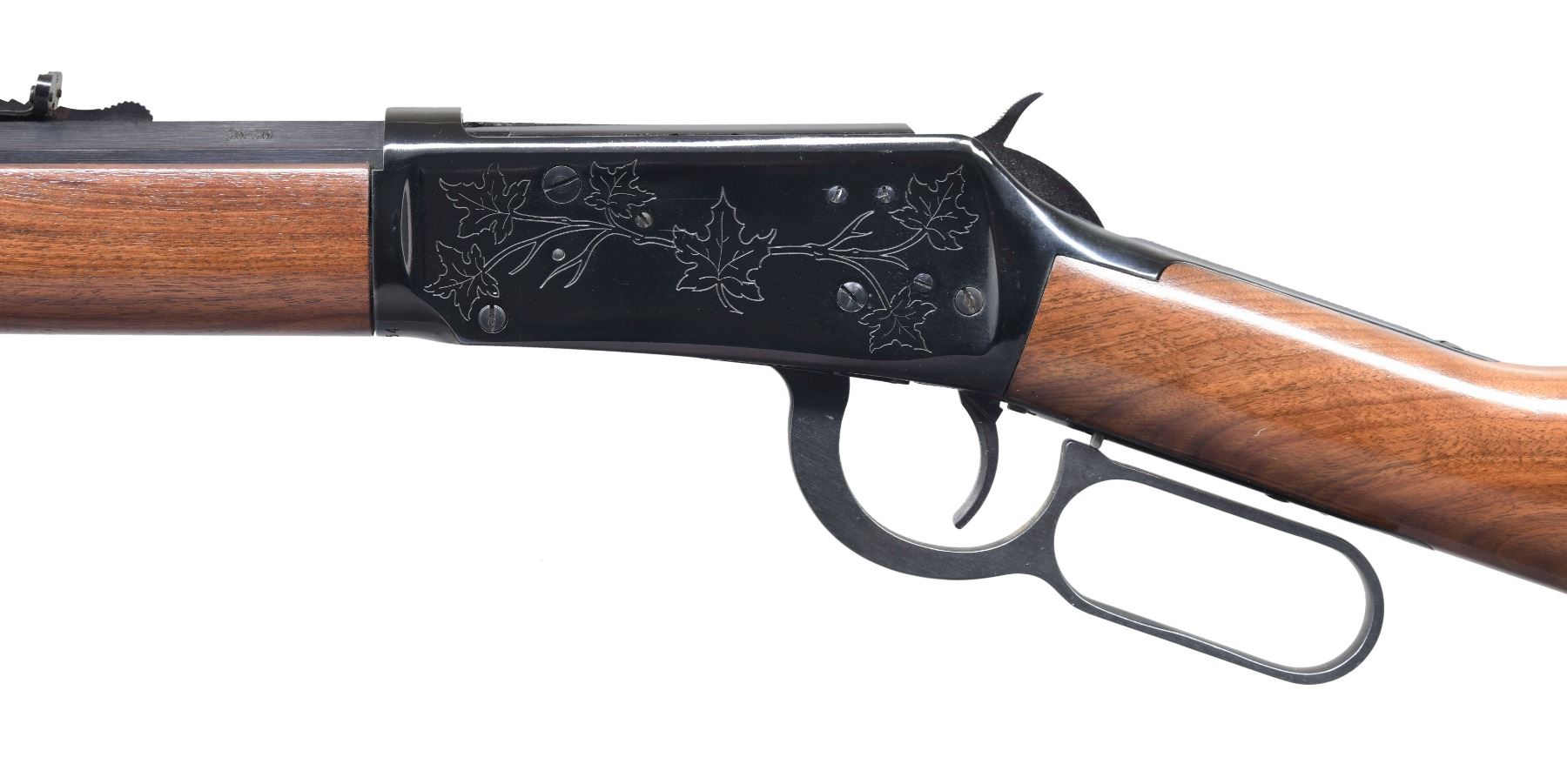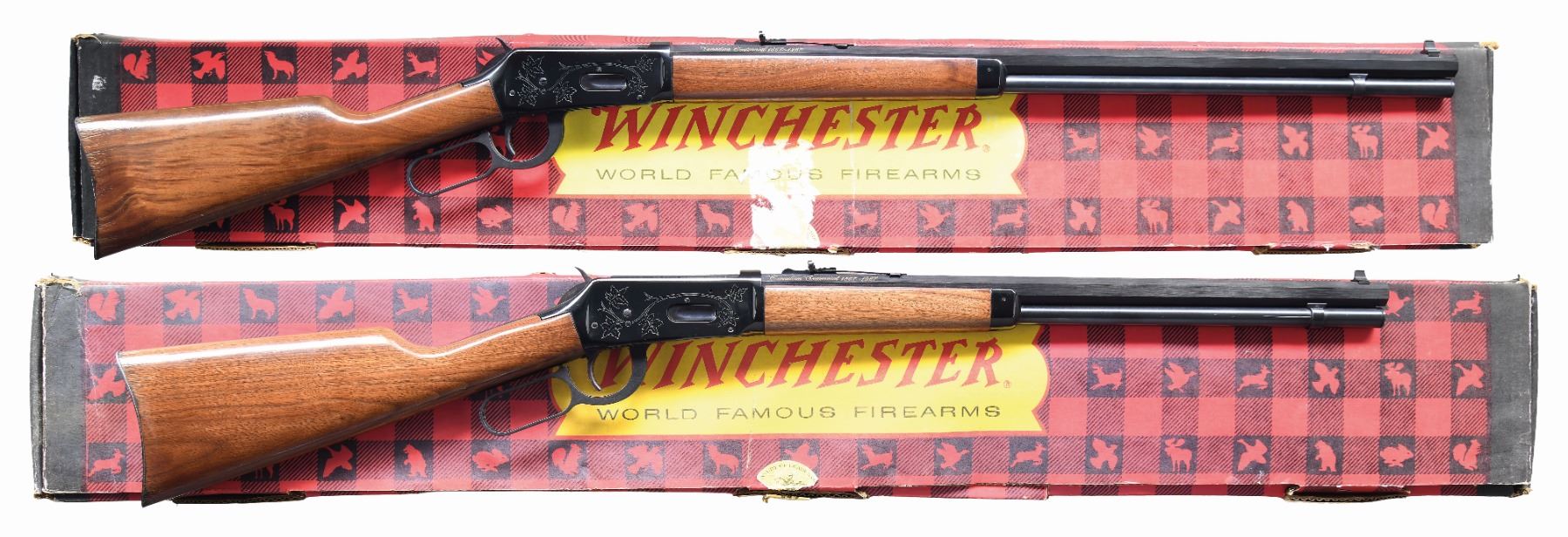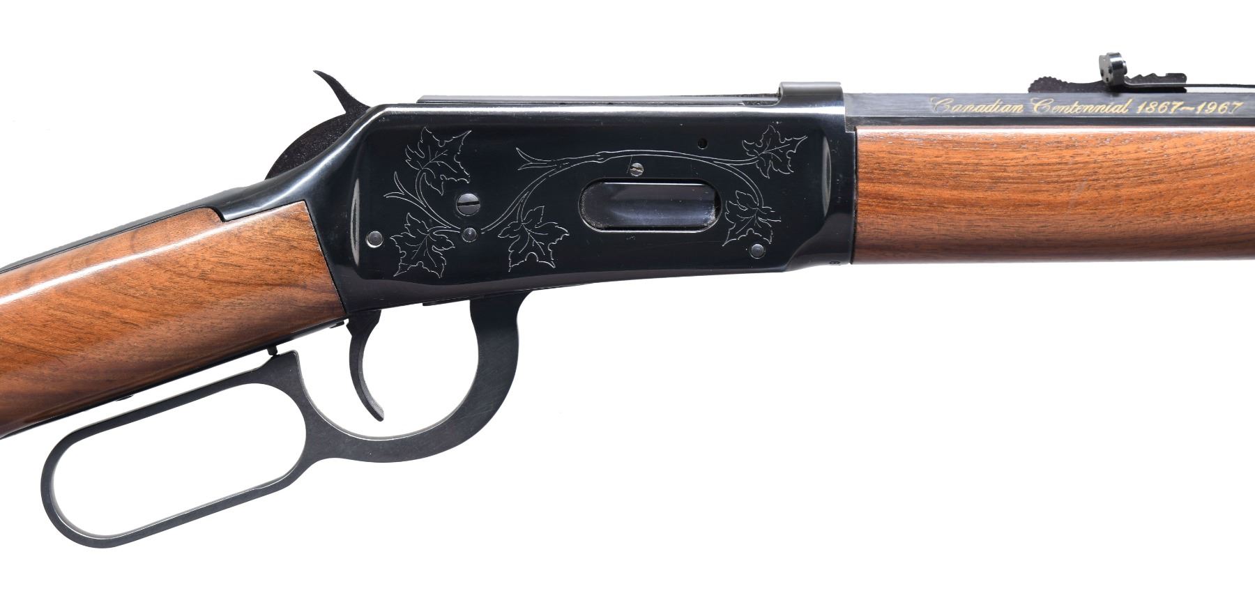 ACTION CARBINE AND RIFLE. Both cals. 30-30. Actions have oak leaf ornamentation on both sides. Top tangs has gold filled marking "CANADIAN CENTENNIAL'67". Right bbl. flats have gold filled markings "Canadian Centennial 1867-1967". Walnut forearm & straight grip stocks w/ curved steel buttplates. Mfg. 1967. GUN 1: S# 67755. Bbl. 20" octagon sporting sights. Full length. mag. UNATTACHED ACCESSORIES: original red & black box containing instructions, hang-tag & warranty papers. CONDITION: appears unfired, retaining 99% original blue. Stock has lifting water damaged finish w/ dark staining around buttplate. Bright near excellent bore. (25-615/DS). GUN 2: S# 67754. Bbl. 26" octagon w/ sporting sights. Full length mag. UNATTACHED ACCESSORIES: original red & black box containing instructions, hang-tag & warranty paper. CONDITION: appears unfired, retaining over 98% blue. Stock has water damage w/ dark staining, lifting finish & small chips around buttplate. Bright near excellent bore. (25-616/DS). BOTH CURIOS. $1,500-2,000.