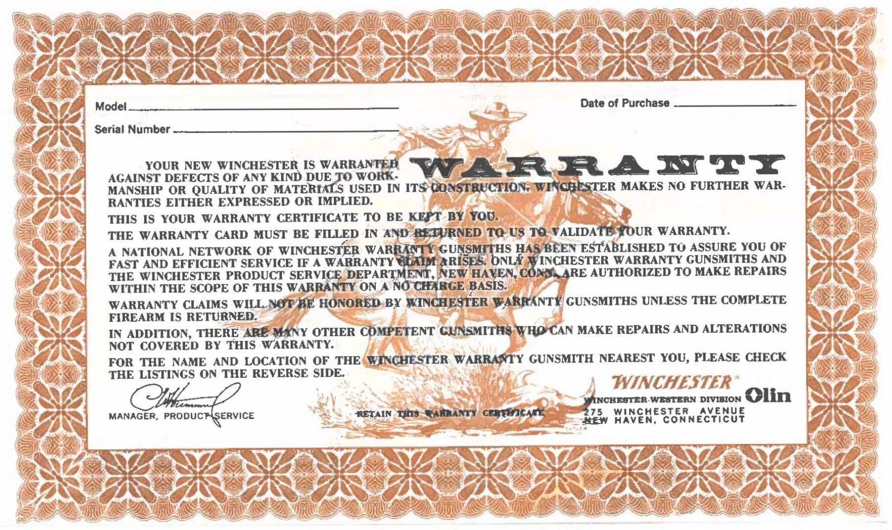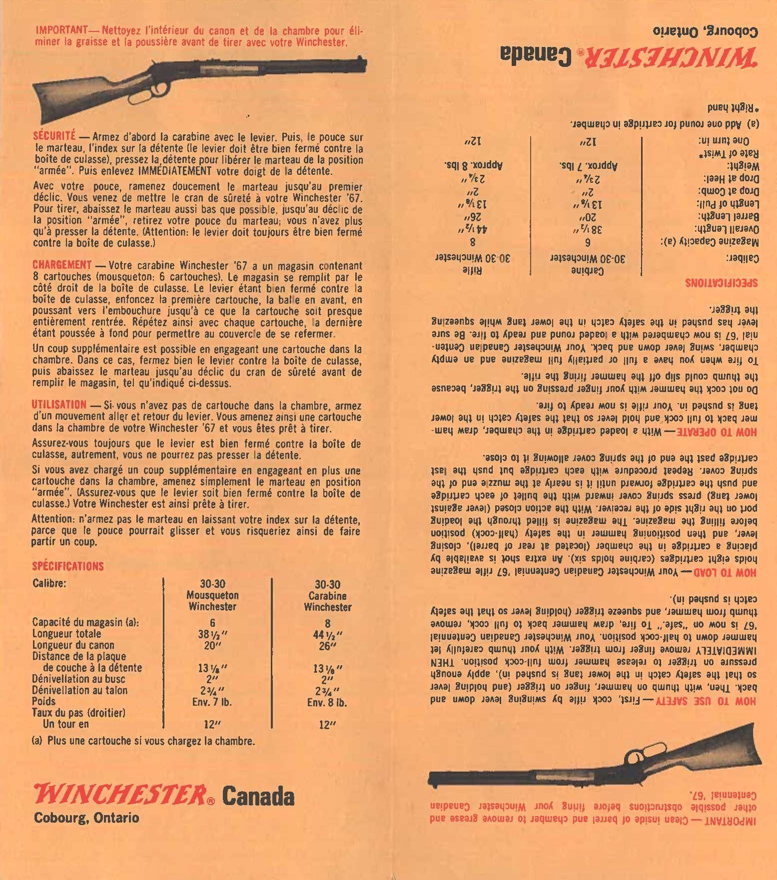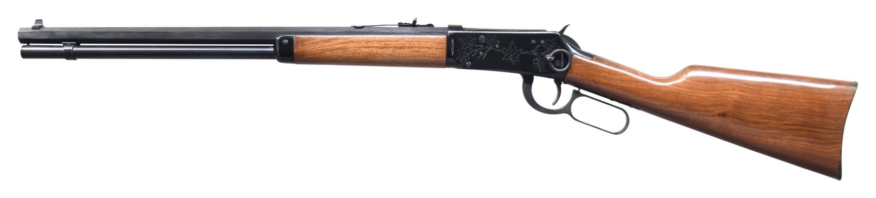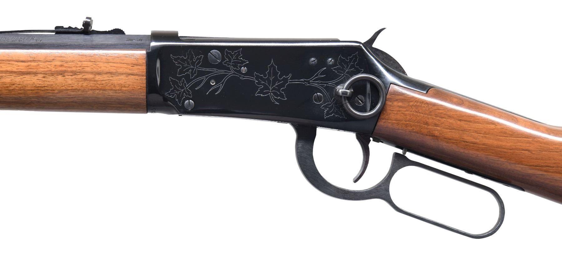 ACTION CARBINE AND RIFLE. Both cals. 30-30. Actions have oak leaf ornamentation on both sides. Top tangs has gold filled marking "CANADIAN CENTENNIAL'67". Right bbl. flats have gold filled markings "Canadian Centennial 1867-1967". Walnut forearm & straight grip stocks w/ curved steel buttplates. Mfg. 1967. GUN 1: S# 67755. Bbl. 20" octagon sporting sights. Full length. mag. UNATTACHED ACCESSORIES: original red & black box containing instructions, hang-tag & warranty papers. CONDITION: appears unfired, retaining 99% original blue. Stock has lifting water damaged finish w/ dark staining around buttplate. Bright near excellent bore. (25-615/DS). GUN 2: S# 67754. Bbl. 26" octagon w/ sporting sights. Full length mag. UNATTACHED ACCESSORIES: original red & black box containing instructions, hang-tag & warranty paper. CONDITION: appears unfired, retaining over 98% blue. Stock has water damage w/ dark staining, lifting finish & small chips around buttplate. Bright near excellent bore. (25-616/DS). BOTH CURIOS. $1,500-2,000.
