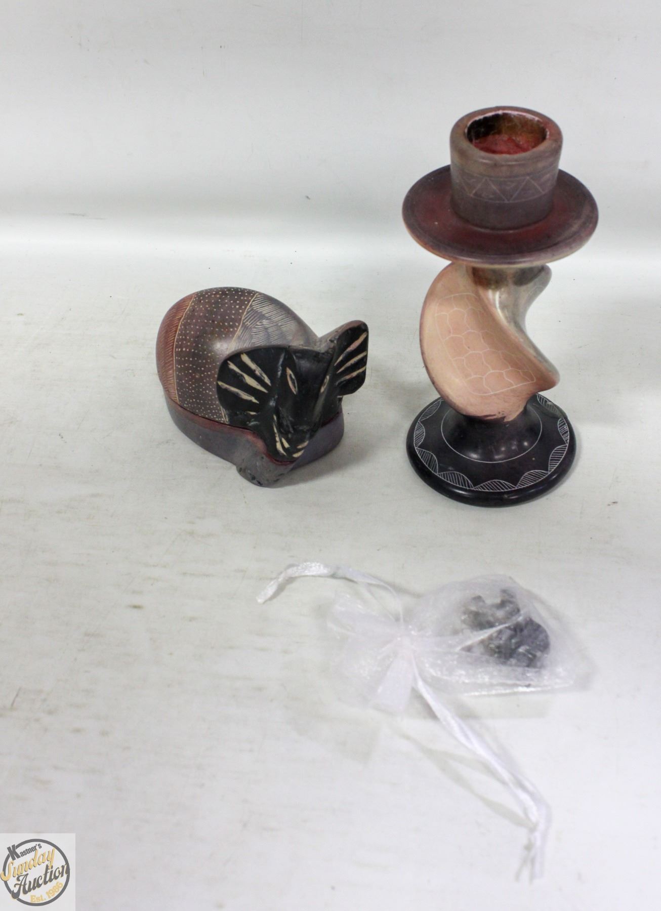 DISH + CANDLE STICK BOTH CARVED FROM SAME TYPE OF STONE + PAIR OF GENUINE ONYX CARVED ELEPHANTS IN CLOTH POUCH **ALL ITEMS MUST BE REMOVED BY 5PM SATURDAY, OCTOBER 4TH 2025. ALL REMAINING ITEMS WILL BE SUBJECT TO A $6.00 PER DAY STORAGE CHARGE. ANY ITEMS REMAINING AFTER MONDAY, OCTOBER 20TH 2025 WILL BE CONSIDERED FORFEITED. NO REFUNDS WILL BE ISSUED FOR FORFEITED ITEMS. TO SCHEDULE A PICK UP APPOINTMENT CLICK HERE