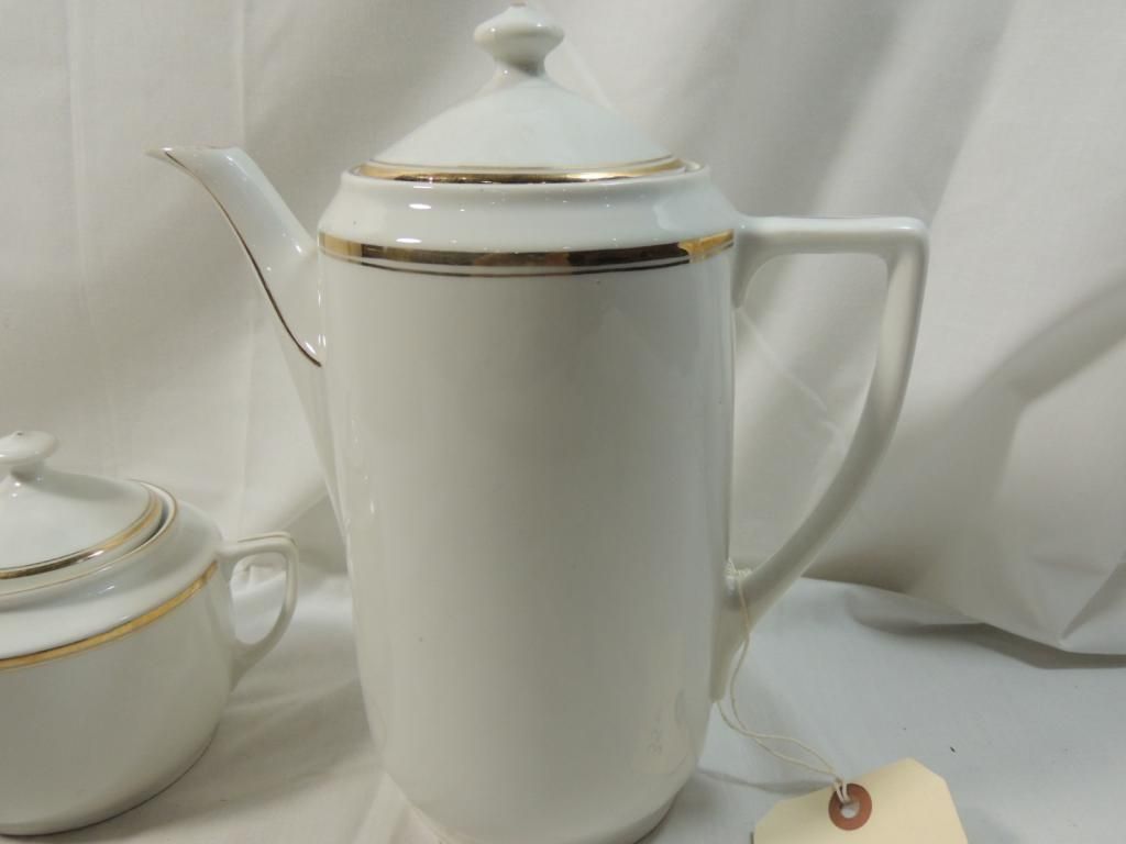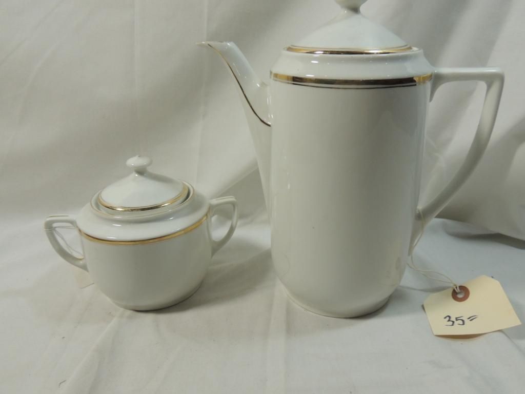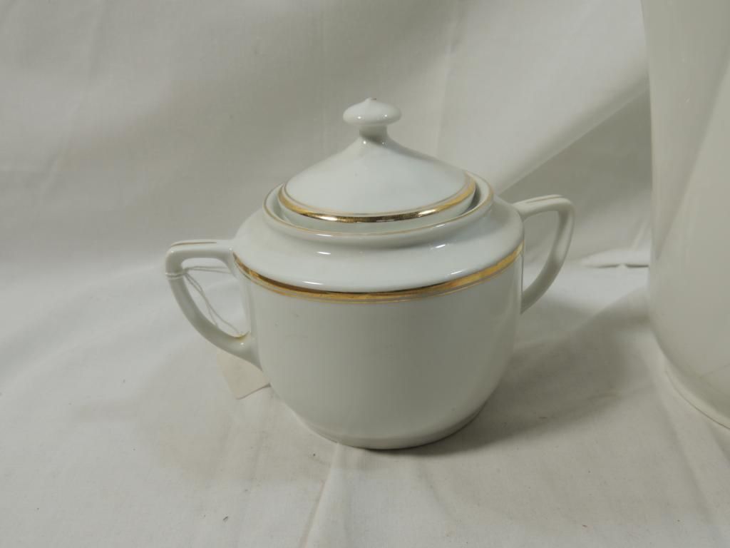 CHINA COFFEE POT TEA POT AND SUGAR BOWL WITH LID. AS SHOWN. WHITE CHINA GOLD DETAIL. AS SHOWN. SEE PHOTO FOR MORE DETAILS.