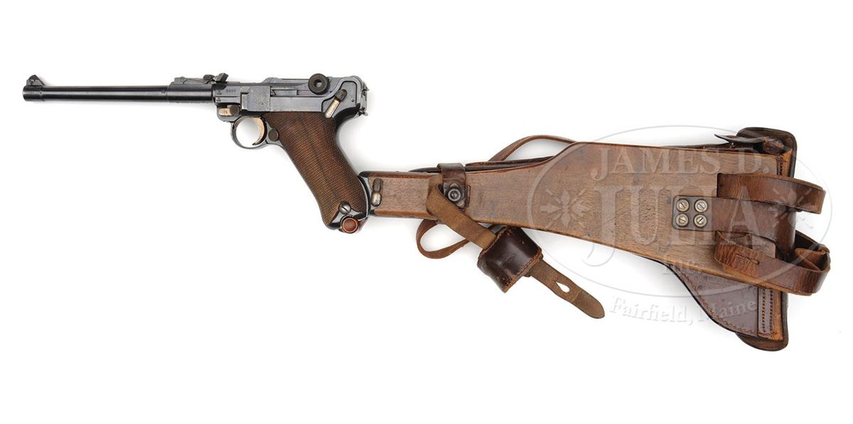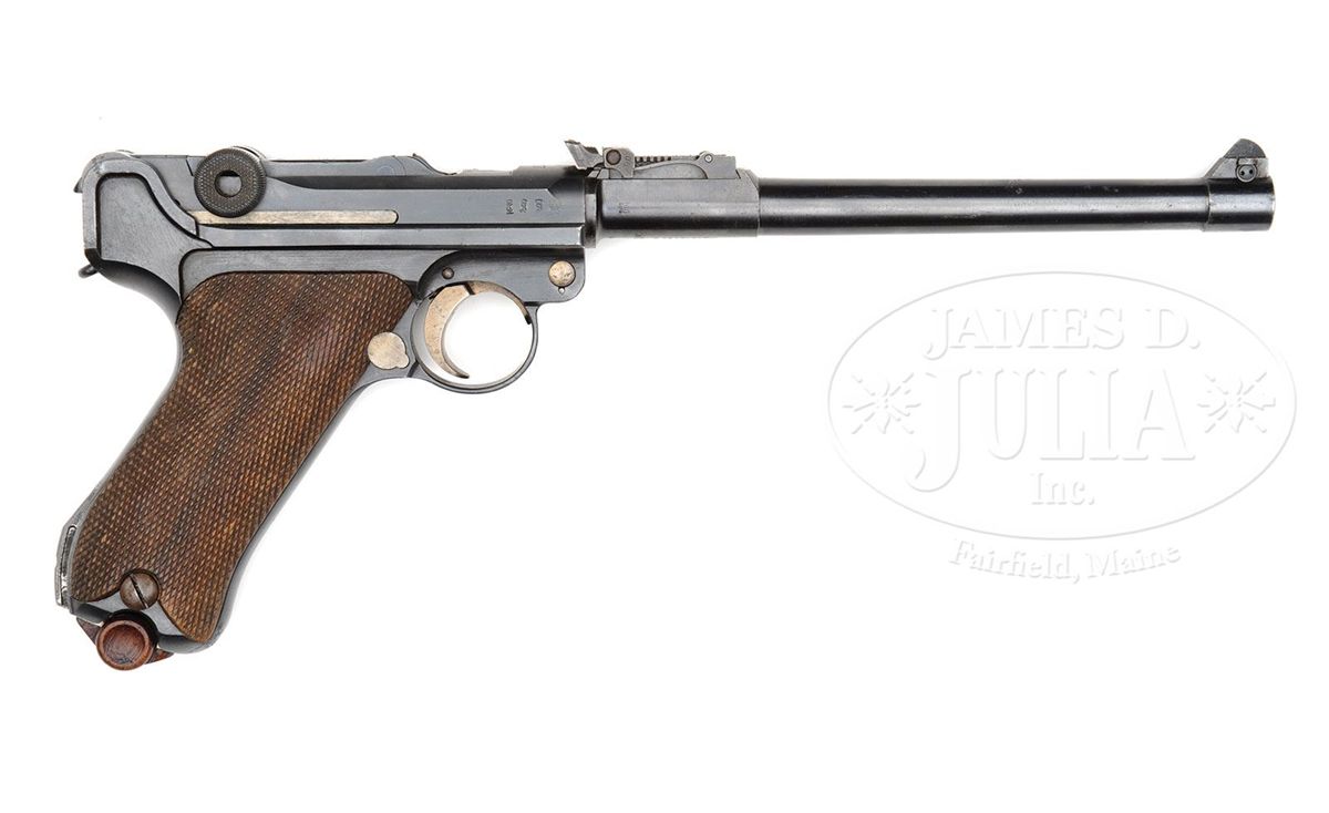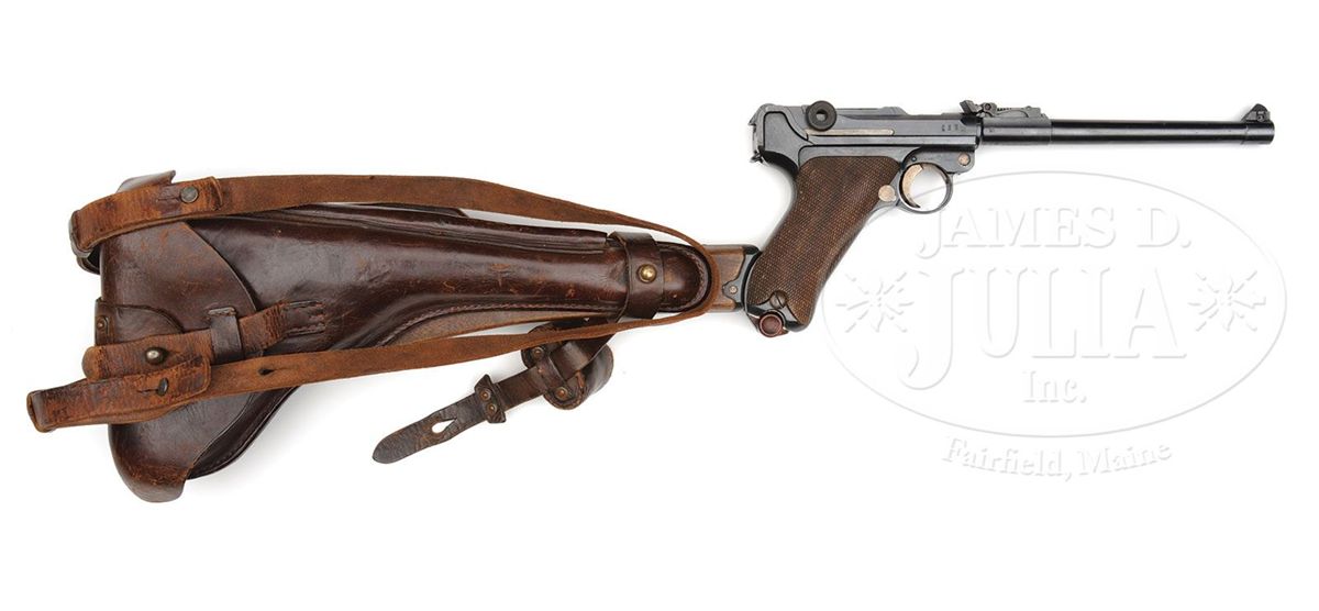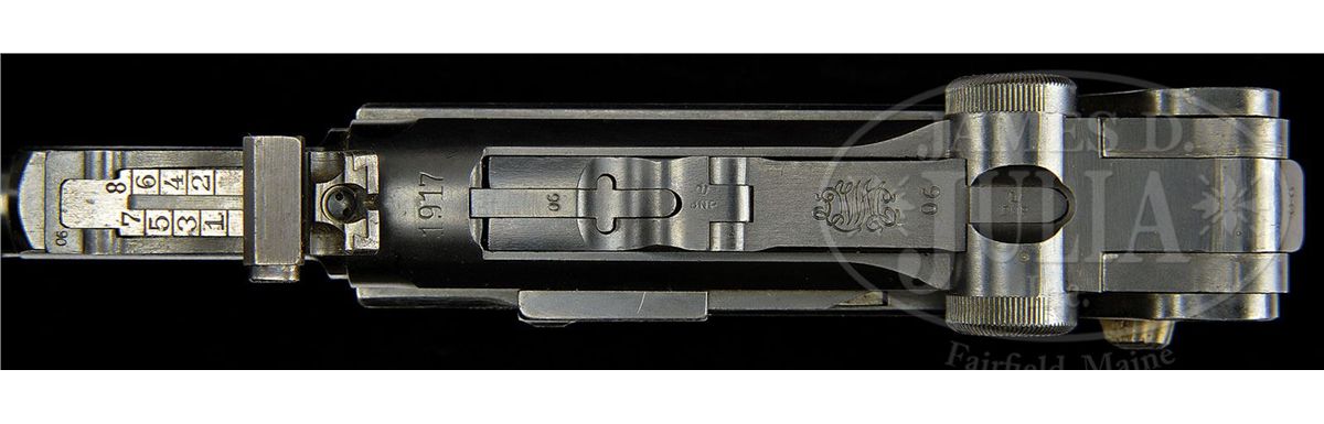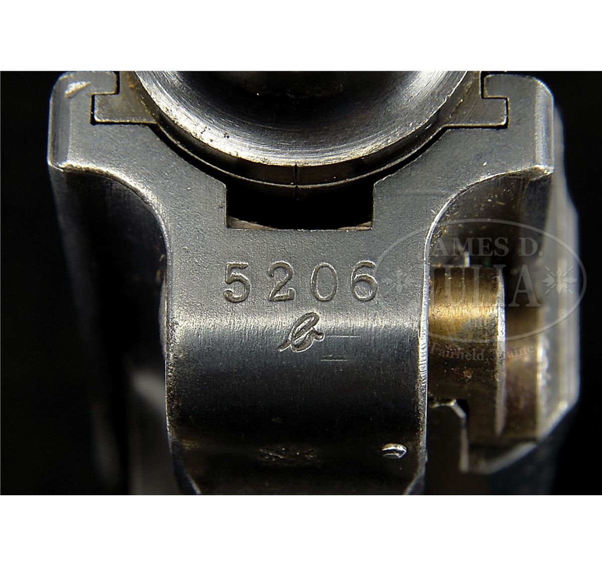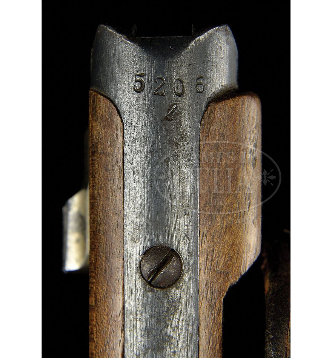 SN 5206B. 8" 9mm bbl with multi position adjustable artillery style rear sight that has fine-tuned adjustment as does front sight. "1917" above chamber. "DWM" on center toggle link. Imperial proofs on right side of receiver. British proofed. Wood bottom magazine is not numbered. All numbered parts are matching. With matching numbered artillery stock and brown leather holster with straps and leather attachments. Date and makers mark inside flap is illegible. Orig Imperial proofed takedown tool and artillery cleaning rod are included. This gun is featured on p. 527 of Dr. Geoffrey Sturgess' The Borchardt & Luger Automatic Pistols. PROVENANCE: Collection of Dr. Geoffrey Sturgess. CONDITION: Excellent. Retains 97% orig bright blue with some light corrosion on sideplate and surrounding area. 90% orig straw with light scattered corrosion. Bore is bright and sharp. Grips are lightly worn with minor indents and nice color and wood grain. Magazine is excellent with minor wear. Mechanics are excellent. Holster is very nice with minor scuffs and some flaking on corners. Straps are wrinkled and flaking. Wood stock is excellent with minor dings and scratches. Takedown tool and cleaning rod are excellent. 4-52065 BWS94