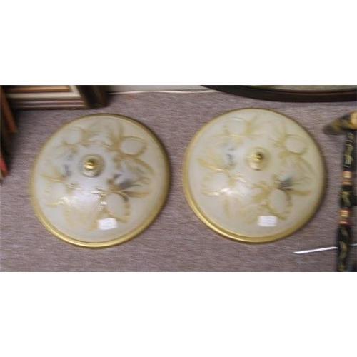 This is a matching pair of 1930s (I believe) ceiling light fixtures. They are frosted glass with a clear embossed design and are complete with a metal rim. As with any old lighting you would want to rewire them. They are in excellent condition with no chips or cracks. They are right at 13" round. It is really nice to be able to find a matching pair.