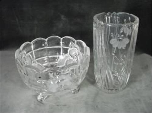 MATCHING SET OF HAND CUT CRYSTAL ON A GEOMETRIC GRID BASE WITH FLORAL MOTIF INCLUDING A VASE 6.5"X3.5" AND FOOTED BOWL 4"X5.75.
