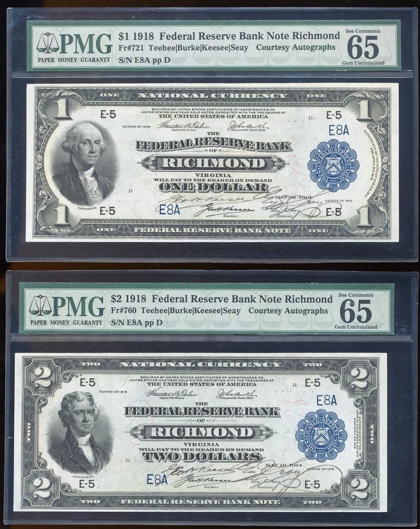 This MATCHING Serial Number Pair of 1918 $1 & $2 Federal Reserve Bank Notes PMG graded Gem Uncirculated 65EPQ. These significant items show two highly popular designs forever entwined with one another. Both pieces are overprinted with the serial number E8A deeply embossed into the paper. They also display courtesy autographs of the banks signing officials above their printed ones. PMG Certified.