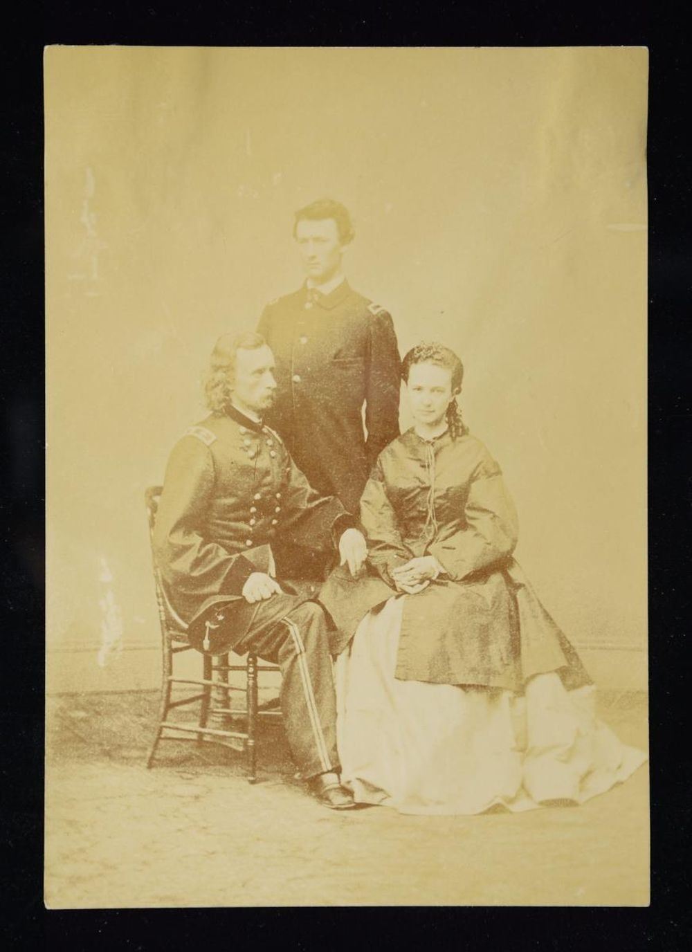 TOM, & LIBBIE CUSTER. 4" x 6" unmounted albumen of Lt. Tom Custer standing, and Maj. Gen'l George Custer & Libbie seated. Photograph taken by Matthew Brady in Washington in 1865. CONDITION: good overall. PROVENANCE: Martin Lane Historic & Western Americana Lifetime Collection. (02-21894/JS). $2,000-3,000.