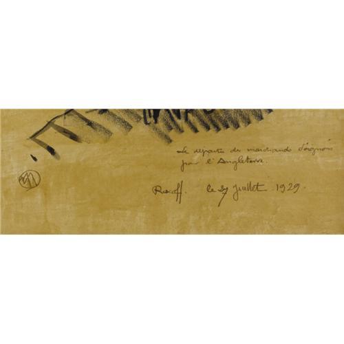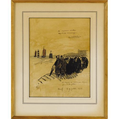 <B>MATHURIN MEHEUT</B></I> (French 1882-1958)<BR><I>Le départ de marchands d'oignons pour l'Angleterre (The departure of onion merchants for England),</B></I> 1929<BR>Mixed media on paper (Ink, crayon, watercolor and varish)<BR>10 x 7-3/4 inches (25.4 x 19.7 cm)<BR>Inscribed upper right: <I>A Madame Minton./ respectueux hommage./ M-Mehuet (To Mrs. Minton/Respectful hommage./ M-Mehuet)</B></I><BR>Inscribed lower right: <I>Roscoff le 27 juillet 1929 (The departure of onion merchants for England/ Roscoff the 27th of July 1929)</B></I><BR>Inscribed with artist's monogram lower left<BR><BR>Provenance:<BR>Jeffrey Basinger, family descent, grandson of Mr. and Mrs. Minton;<BR>Mary Anne Minton, family descent, daughter of Mr. and Mrs. Minton;<BR>Harriet and John Preston Minton<BR><BR> <B>Condition Report:</B> minor cracking fixing varnish on dark figures<BR><BR><b>Shipping:</b> Requires 3rd Party Shipping (<a target="_blank" href="http://www.heritageauctions.com/common/shipping.php">view shipping information</a>)