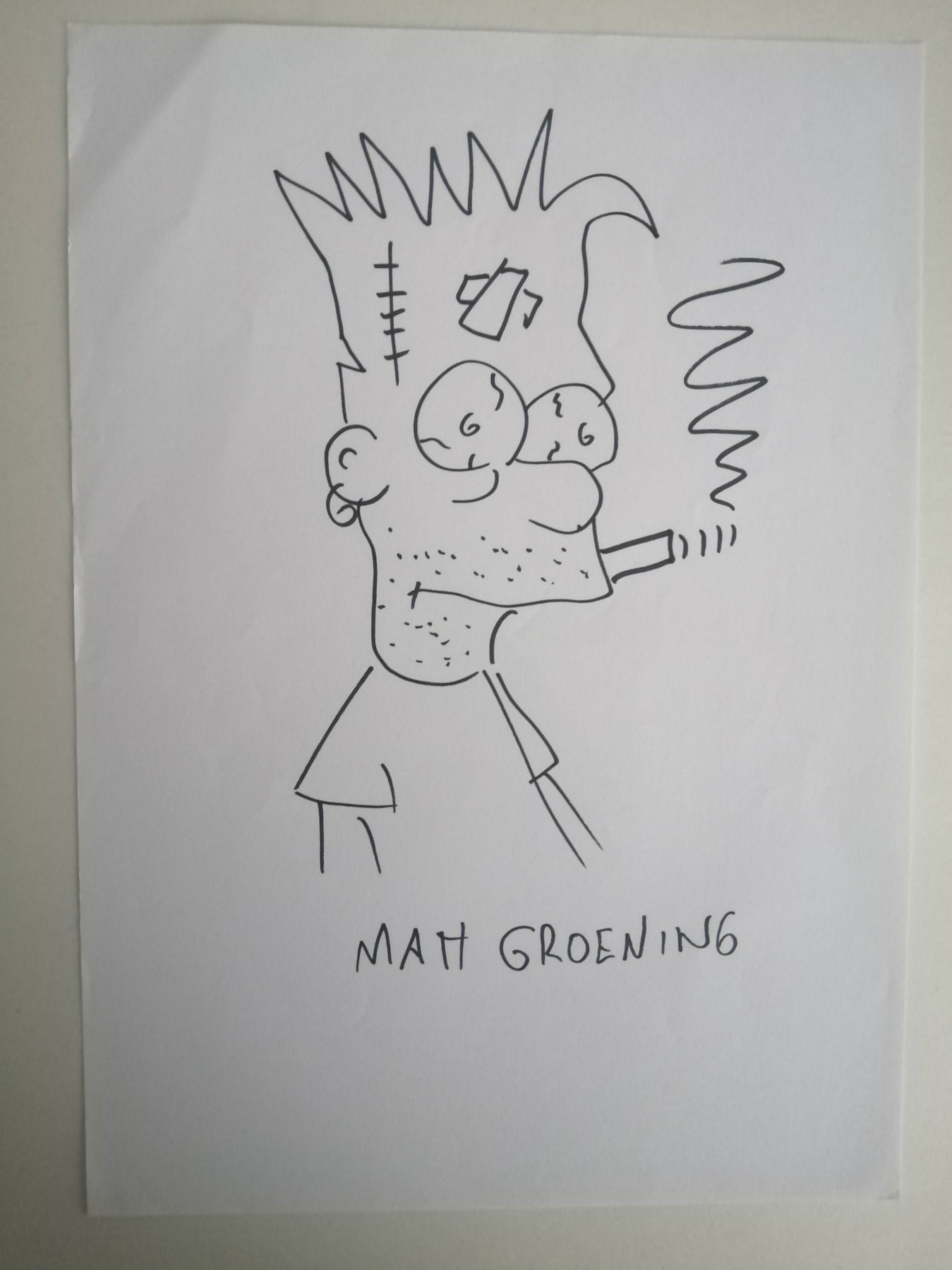 A drawing of Bart Simpson on A4 paper by Matt Groening. Supplied with coa. With creasing in left hand corner.