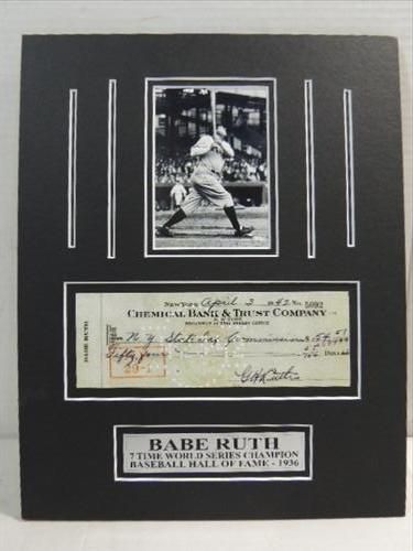 MATTED 11X14 BASEBALL PHOTO & FACSMILIE BANK CHECK BABE RUTH. AS SHOWN. VIEW PICTURE FOR DETAIL.