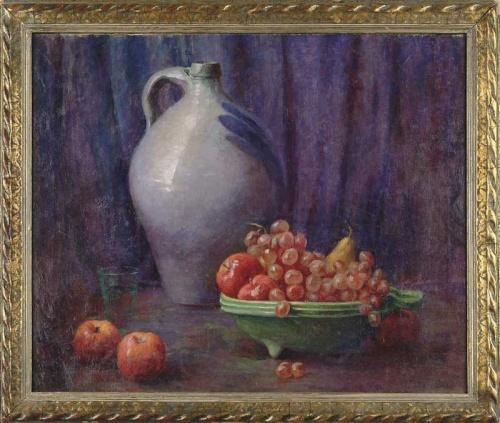MAUD FOX BERNEKER (American, 1882-) STILL LIFE WITH STONEWARE JUG AND FRUIT. Colorful still life oil on canvas tabletop scene shows a large decorated stoneware jug in back of a green footed bowl having apples, red grapes and pear with apples and grapes with green glass beside. All against a purple mottled background. Signed "M. Berneker" bottom right. Housed in an antique gesso decorated frame. SIZE: 25" x 30". CONDITION: Strip lined with two canvas patches to reverse. Some inpainting, very good. 9-27275