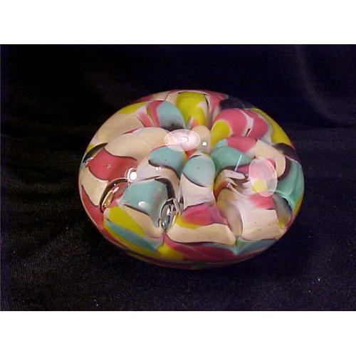 THIS MAUDE & BOB ST. CLAIR PAPERWEIGHT HAS PARIS GREEN, PINK, AND YELLOW SWIRLS OF GLASS THROUGHOUT. IT WOULD LOOK GREAT ON A 1940'S STYLE DESK. MADE IN 1979, ACCORDING TO THE STAMP ON THE BOTTOM OF THE PAPERWEIGHT. THIS WOULD MAKE A GREAT ADDITION TO ANY PAPERWEIGHT COLLECTION.
