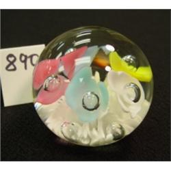 St. Clair paperweight. Maude & Bob St Clair 1984 marked on bottom. 2.5" tall and 2.5" wide. Five flowers, two shades of blue, white, yellow and pink on white. Condition: Very Good
