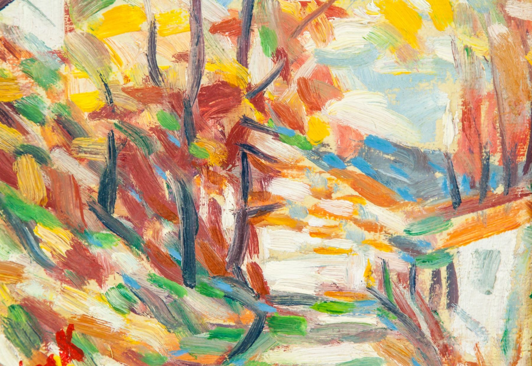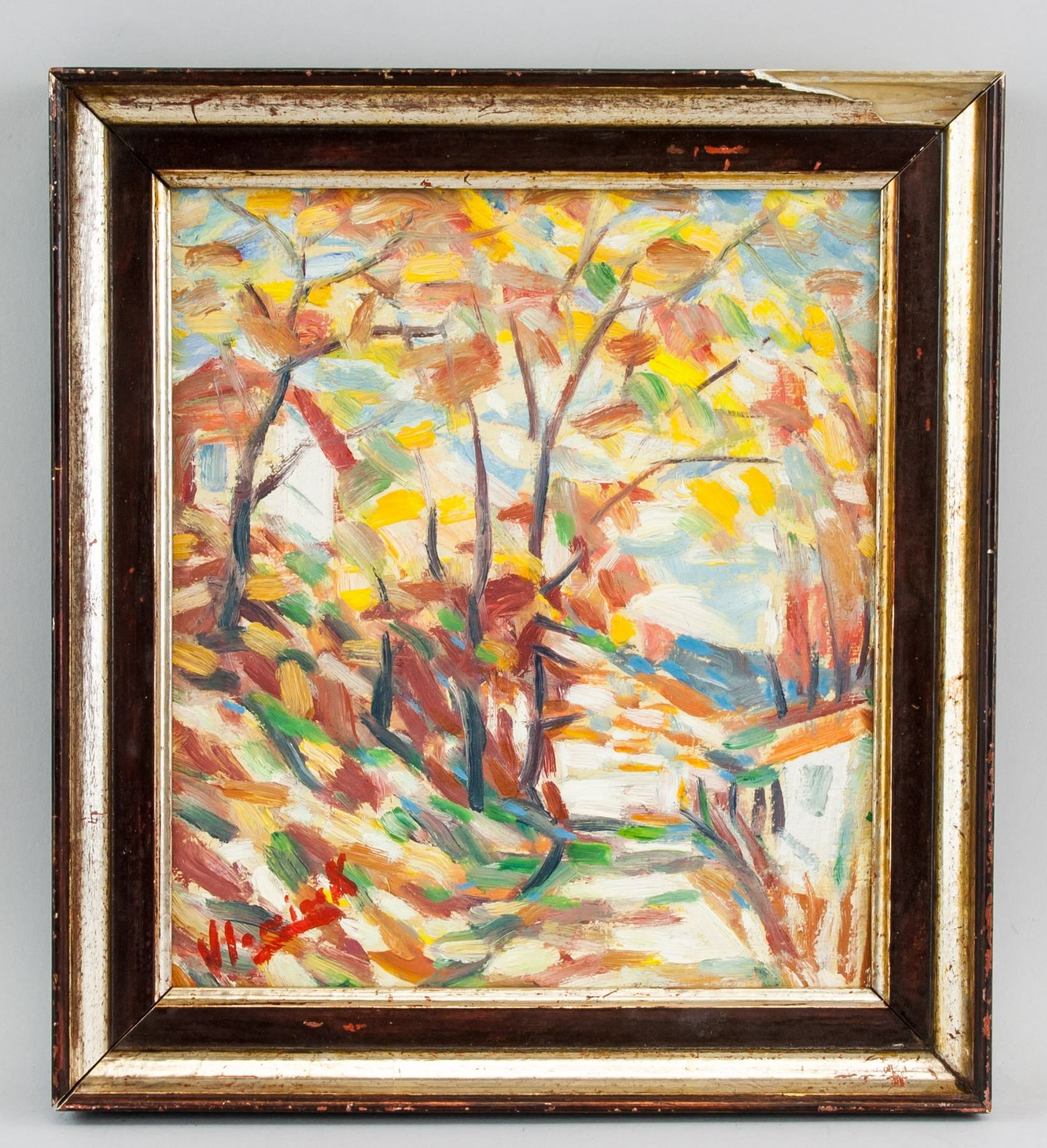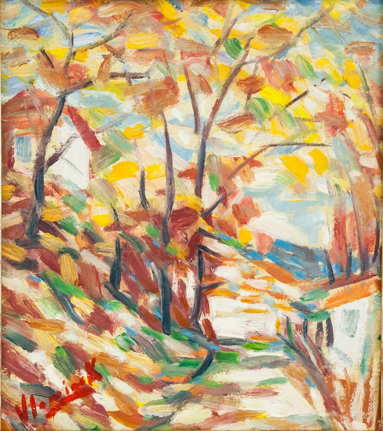 Oil on board. Featuring autumn landscape scene. Signed and attr. Maurice de Vlaminck. 9.6 x 8.7 in. (24.5 x 22 cm). Maurice de Vlaminck is closely associated with the Fauves, a turn-of-the-century group of painters known for adopting a radically new, vibrant palette and applying large areas of pure, flat color. Most strongly identified with Henri Matisse, this style is evident in de Vlaminck’s well-known works Bateaux-Lavoirs and Portrait of Derain (both 1905), featuring van Gogh-inspired coloration and expression. Shortly thereafter, de Vlaminck grew more concerned with compositional structure, creating dramatic landscapes inspired by Paul Cezanne. As his style continued to develop, he adopted a more severe palette and became known for his depictions of violet-hued, stormy skies reigning over the windswept French countryside. PROVENANCE: Southern Ontario estate