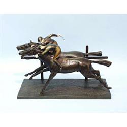 MAURICE GUIRAUD-RIVIERE 20th century French school. "End of the Race." A finely cast bronze and ivory figural group. The two-tone patinated jockeys on board the running horses with finely carved ivory faces and heads. Signed on naturalistic base. A similar model illustrated in B. Catley, "Art Deco and Other Figures," page 172. Ref. Benezit, volume 4, page 512. 14000-15000