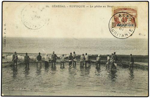 1907 Picture post card of Rufisque, Senegal addressed to Mauritania with TAX handstamp and Mauritania postage due 10 cent red brown (Yvert 10) applied and cancelled by ALEG MAURITANIE double ring. A rarely offered postage due on card from this French West Africa colony. Singed Calves.
