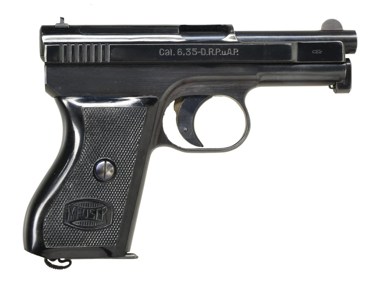 Cal. 6.35mm (25 ACP). S #425780. Bbl. 3". Matching numbers on bbl. & slide. Left side of frame has Mauser Banner. Left side of slide has Mauser Oberndorf address. Right side of slide marked "Cal. 6.35-D.R.P.u.A.P." & w/ crown U proof. Checkered black plastic grips w/ Mauser Banner. MAGS: 1-9 rd. CONDITION: left grip panel has a small crack at top, grips otherwise show scattered light handling wear. Metal retains 95% original blue finish. Very good bore. (22-3057/MJC). CURIO. $400-700.