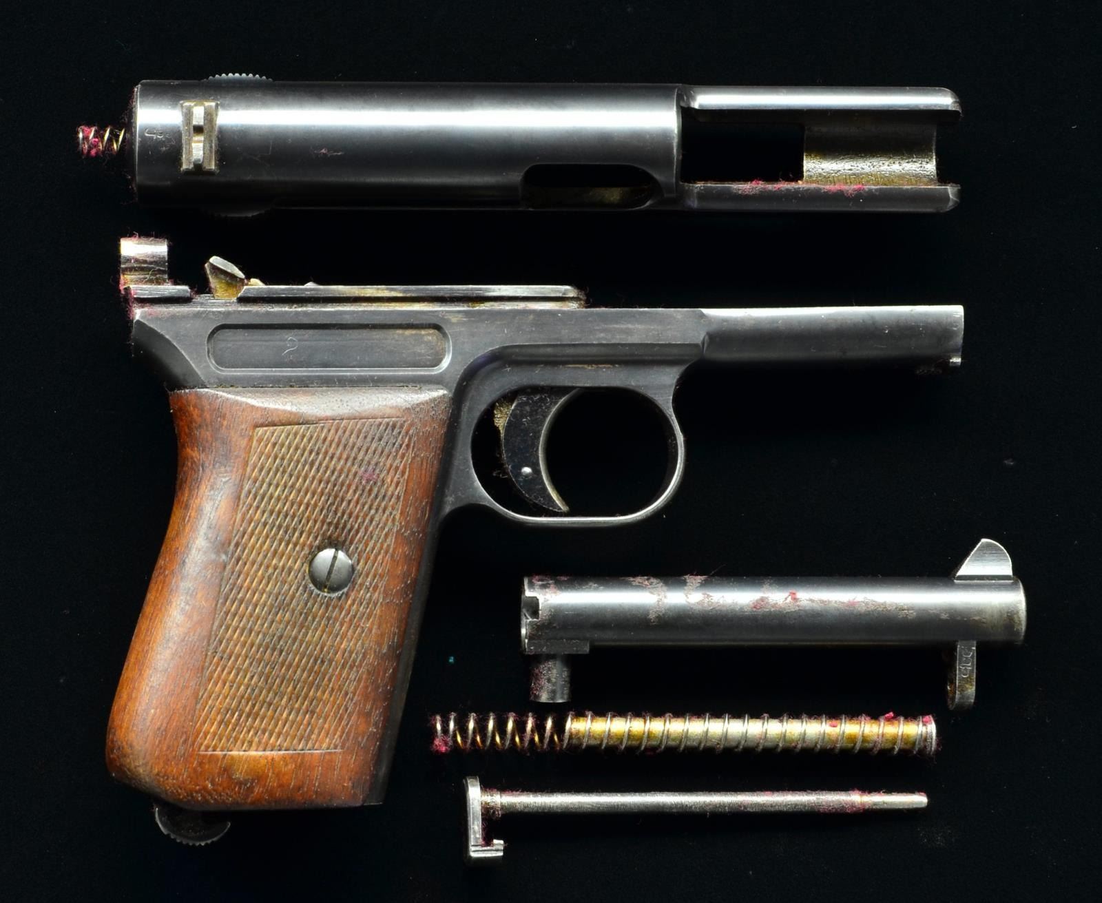 Cal. 7.65mm (32 ACP). S #7306. Bbl. 3 3/8". Early 1914 pistol w/ two line address on slide. Includes the following parts: frame, grips, grip screws, trigger assembly, magazine release, decocker, slide, recoil spring, recoil spring guide, firing pin, bbl. & takedown rod. Crown U proof behind rear sight. All visible numbered parts matching. Checkered walnut grips. MAGS: none present. CONDITION: show light handling wear w/ a dent on top of right screw hole. Metal retains 80% blue w/ a few small spots of light oxidation, scattered thinning & fading. Very good bore. (22-3178/MJC). MODERN. $200-500.