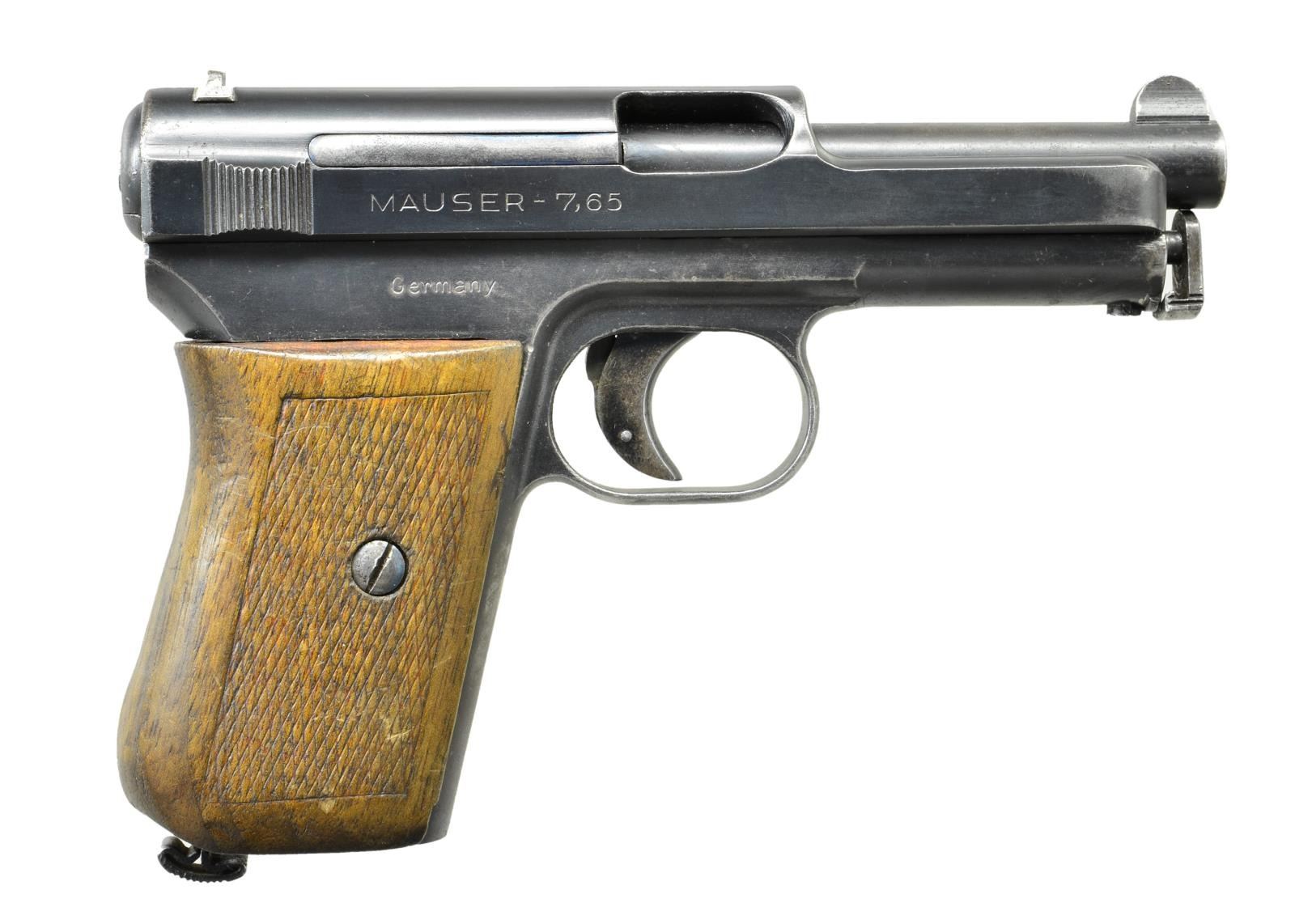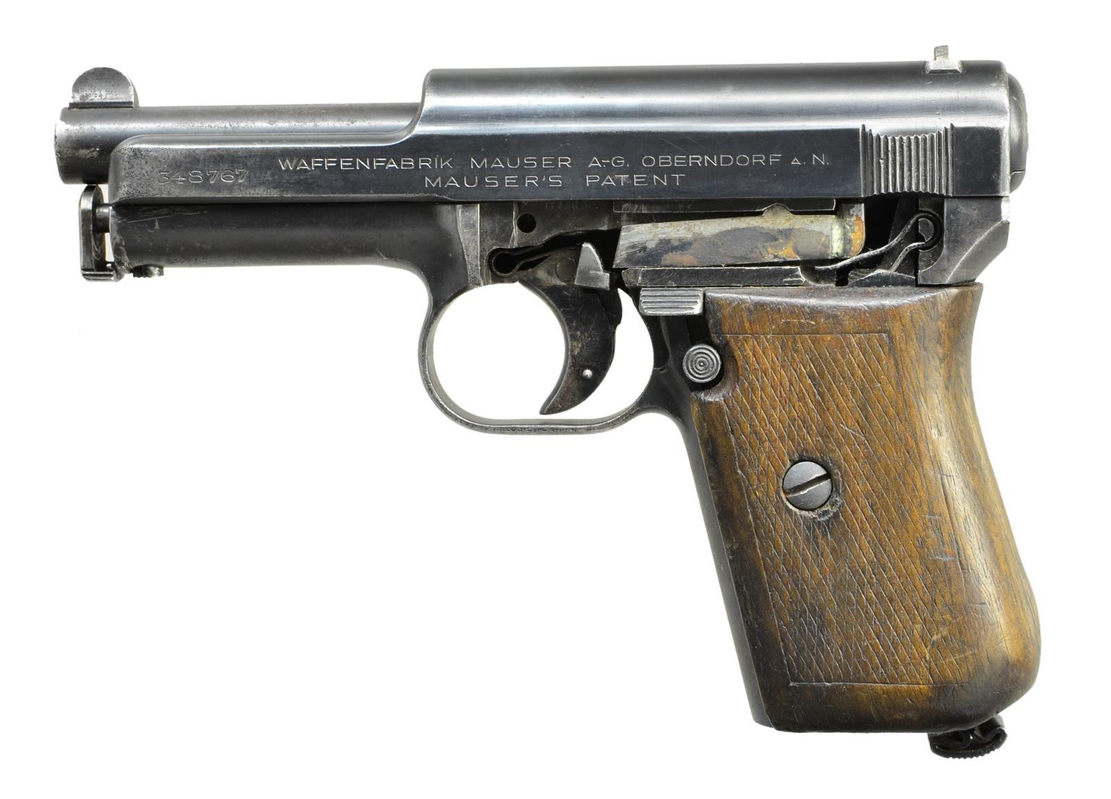 Cal. 7.65mm (32 ACP). S# 348767. Bbl. 3 1/2". Top rear of slide has crown over U Imperial army proof. Matching number on slide & frame. Right side of frame has "GERMANY" marking. No left sideplate present. Checkered walnut grips. MAGS: none. CONDITION: grips show overall heavy wear w/ worn checkering, dings, scratches & handling marks. Metal retains 50% original blue w/ some dings on bbl, high edge wear, scattered fading to gray & a few spots of of oxidation. Front takedown nut is loose. Worn bore w/ scattered pitting. (22-3209/MJC). CURIO. $100-200.