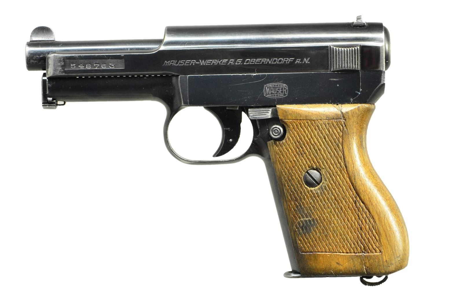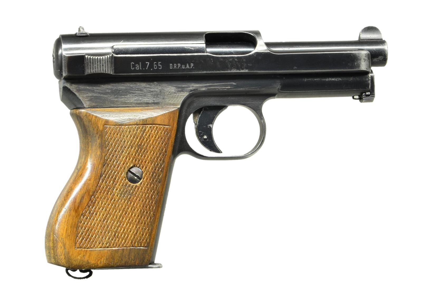 Cal. 7.65mm (32 ACP). S #548763. Bbl. 3 3/8". U notch rear sight. Fixed blade front sight. Crown U proof behind rear sight. Matching numbers on bbl. & slide. Decocker does not appear to be working properly. Checkered walnut grips. MAGS: 1-8 rd. CONDITION: left side of grip has a lengthwise repaired crack, grips show scattered dings & handling marks. There is a grind mark area between right side of slide & grip. Metal retains 75% original blue w/ high edge wear & scattered fading. Very good bore. (22-3214/MJC). CURIO. $300-550.