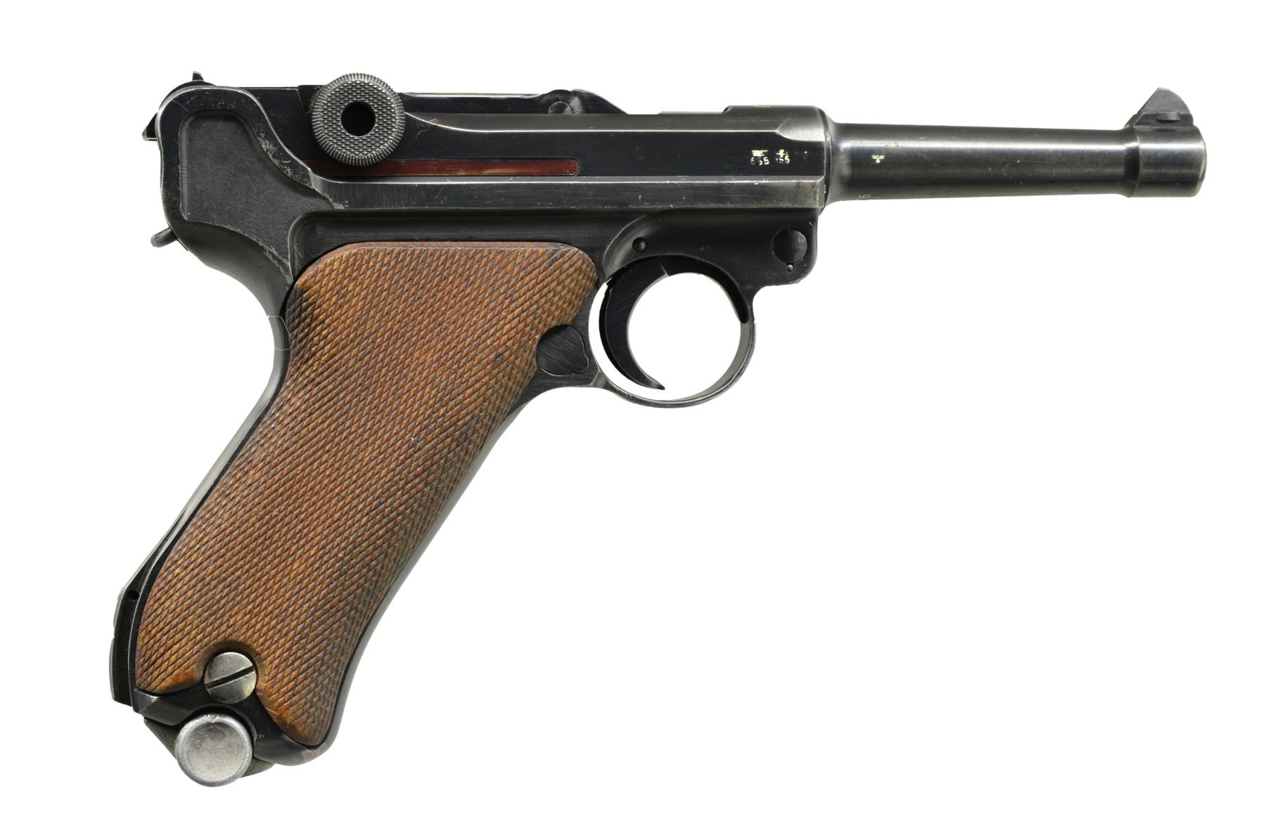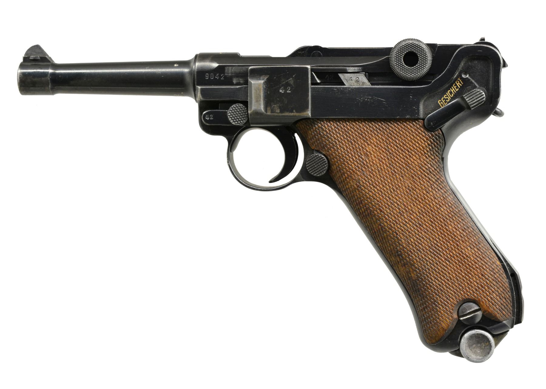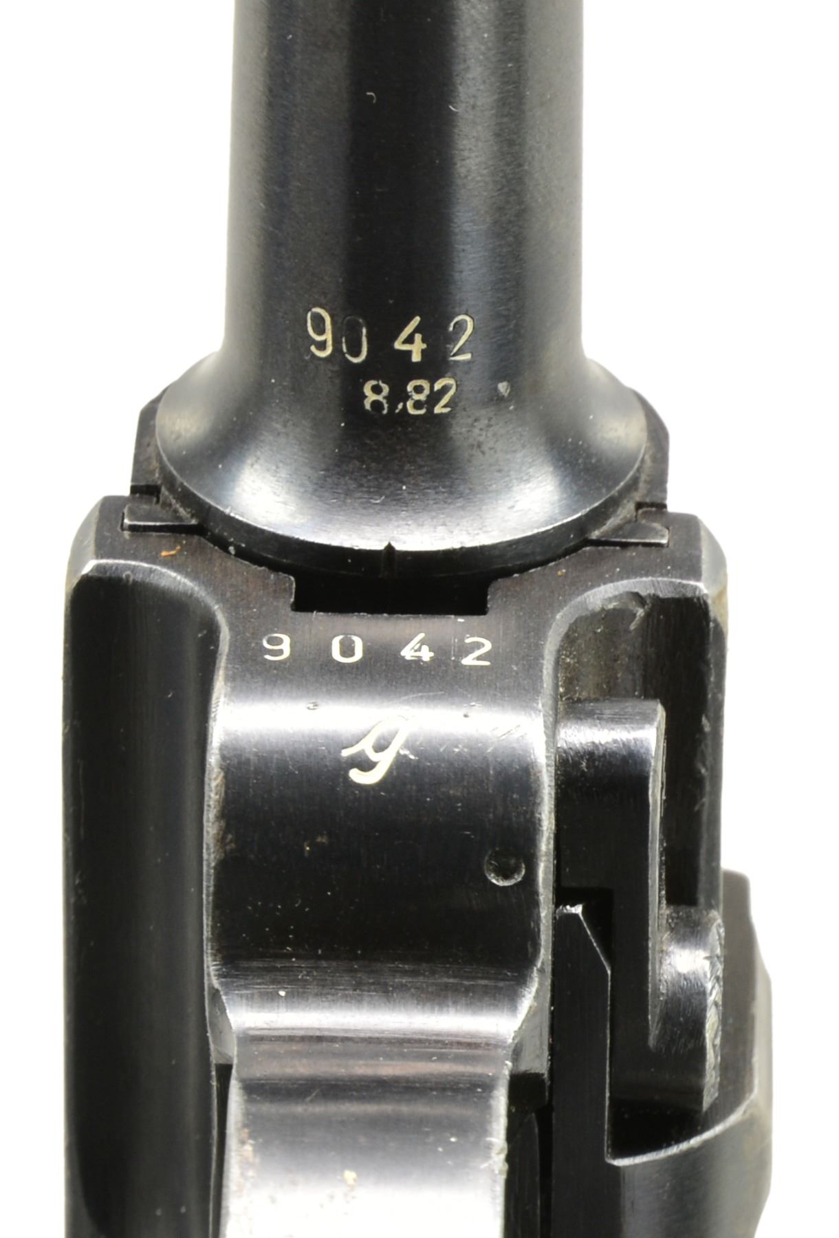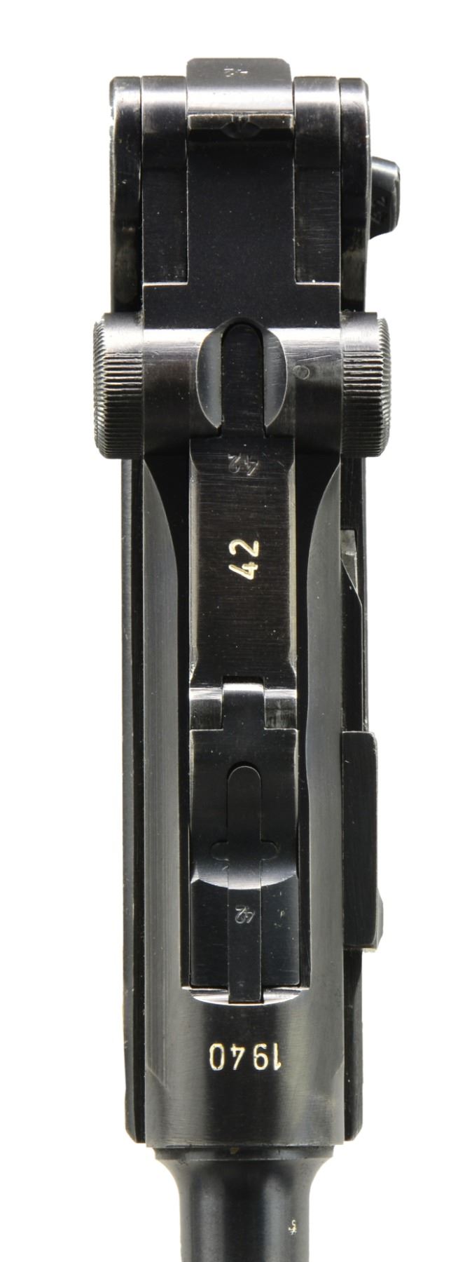 Cal. 9mm Luger. S# 9042g. Bbl. 4". Toggle assembly marked 42 & chamber dated 1940. Most frequently encountered WWII Luger w/ some dated 1939. All metal parts matching numbered including rear toggle pivot. Checkered walnut grips; left grip numbered 20, right 21. Correct features including all blued finish. Plum hued ejector. MAGS: 1 very good refinished blued 8 rd. w/ aluminum base numbered 2970b plus eagle 63 proof. CONDITION: very good appearance having arsenal quality refinish. Light fading mixed w/ faint cleaned oxidation near muzzle. Occasional sm. spot of peppery oxidation. Typical sideplate high point wear plus function wear. Very good grips w/ right fitting somewhat loose. Poor bore w/ noticeable wear & pitting. (20-341/NW). CURIO. $900-1,400.