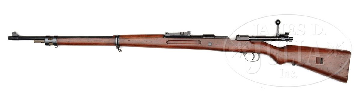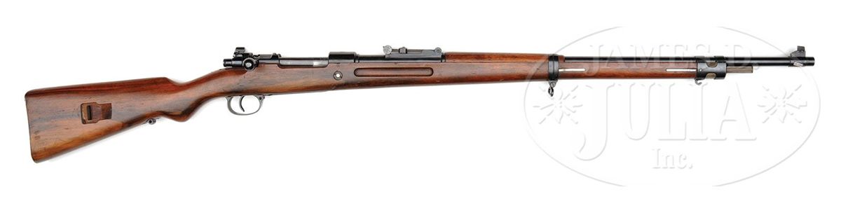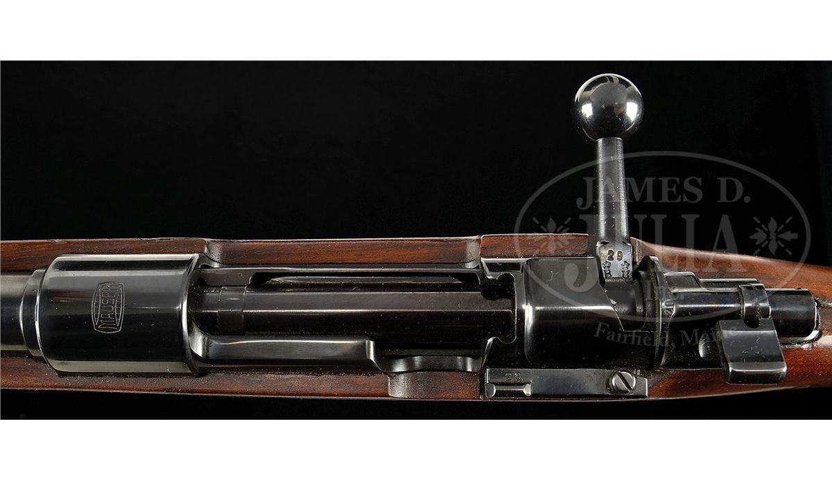 SN 29. Cal. 7x57 mm. Excellent condition interwar Mauser Wehrmanngewehr, based on the G98, manufactured by Mauser-Werke, Oberndorf, on special order. This weapon appears to be all matching including blued straight handled bolt assembly. Top receiver is marked with the Mauser Barrel logo and left side bears the two-digit SN 29, BUG N proofs, firm's name and address. Left side bbl marked with weapon SN only. Micrometer tangent rear sight is similar to the Kar 98b with preset distance 300 meters. Nice walnut stock has finger grooves, all orig finish and no visible markings or numbers. High polished steel buttplate and bayonet lug left in the white. PROVENANCE: Collection of Dr. Geoffrey Sturgess, ex-Visser collection. CONDITION: Bore is dark, with strong lands and grooves, and should clean up. Stock is in overall excellent original condition with only very slight handling marks and few scratches. 4-53160 DW51