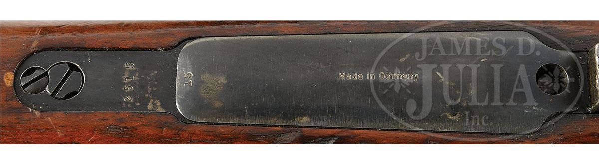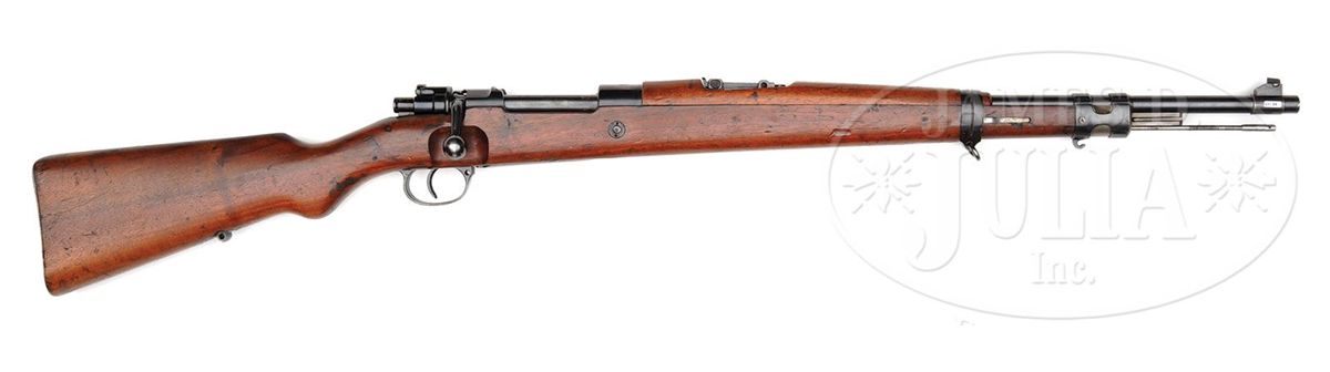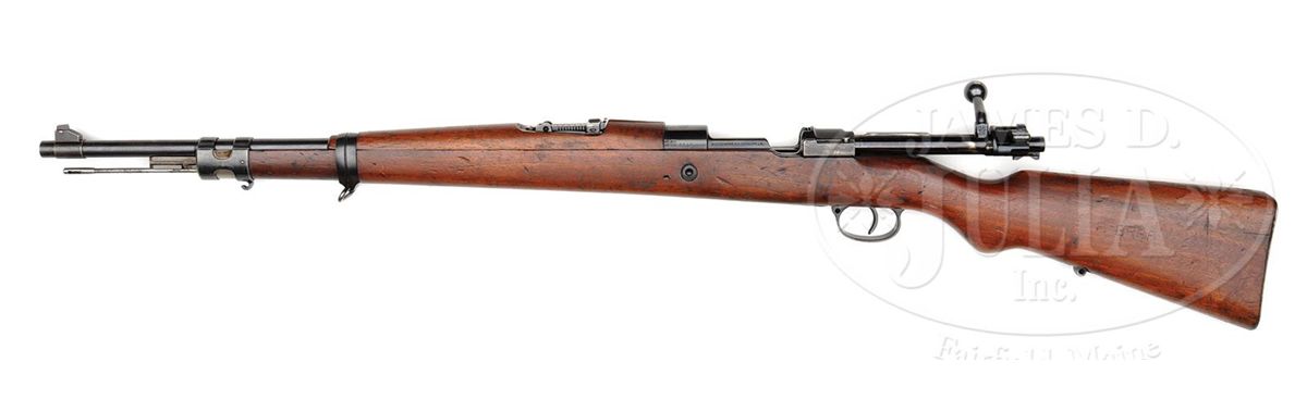 SN 2515. Cal. 7mm. Mauser K98k Carbine Chinese contract, 50 mm shorter barrel than K98k and Standard Modell rifle. Manufactured by Mauser for export in the interwar years. All matching, high polished blue, which is in overall 98% condition. Top receiver is marked only with the Mauser Barrel logo and left side is marked with commercial BUG N proofs, SN and "MAUSER-WERKE A.G. OBERNDORF a/N.". Trigger guard and floorplate likewise numbered to the gun with an additional "Made in Germany" marking. Similar configuration to the Vz 24 rifle, with full handguard and rear sight graduated to 1400 meters. Hardwood stock bears no proofs or SN's, but does have "F.GRAF" and "11632" lightly hand scratched into the left stock. Comes with period cleaning rod. PROVENANCE: Collection of Dr. Geoffrey Sturgess. CONDITION: Bore is excellent, shiny, with strong lands and grooves. Stock is in overall very good to excellent condition with slight handling marks, dings and additional markings as noted above. 4-53161 DW44