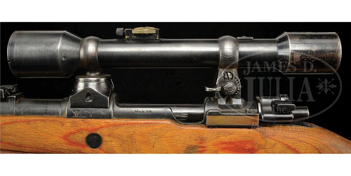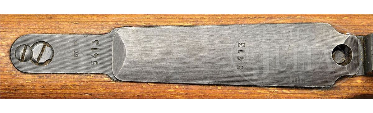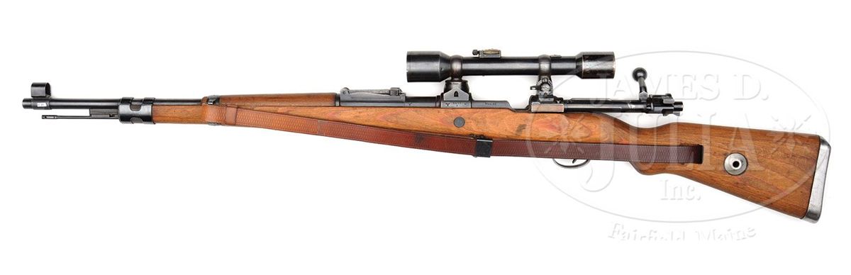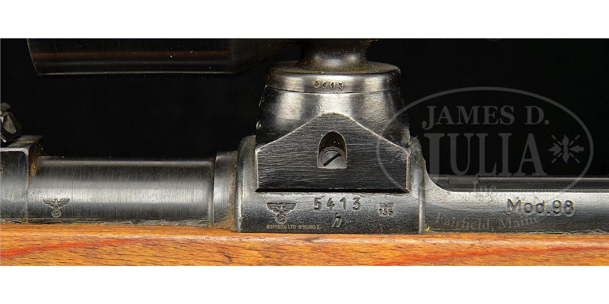 SN 5413h. Cal. 8mm. Authentic matching WWII Mauser produced low turret K98k sniper rifle. Receiver side marked Nazi era firing proof, SN 5413h, WaA 135, representing Mauser-Werke, Obernderf. Bolt assembly and all external metal parts matching. Typical authentic soldered and screwed front mount with soldered and screwed rear mount marked WaA 135. Authentic, blued front turret mount ring numbered 5413 and four-power scope marked "AJACK 4x90". SN of the scope is 42779 with additional "+", correct three-post reticule. Red glue laminate stock is marked Eagle/WaA 135 on right butt. Comes with a very nice authentic serviceable ink-marked "4" leather sling. Comes with orig wartime cleaning rod. Overall fine all-matching example of German Army low turret sniper set. PROVENANCE: Collection of Dr. Geoffrey Sturgess. CONDITION: Very good to excellent with 98% bluing, early front band may have been polished. Scope exterior is very good, optics are clear. Bore has strong lands and grooves, but frosted. Stock is very good with scattered handling marks and scratches. 4-53153 DW33