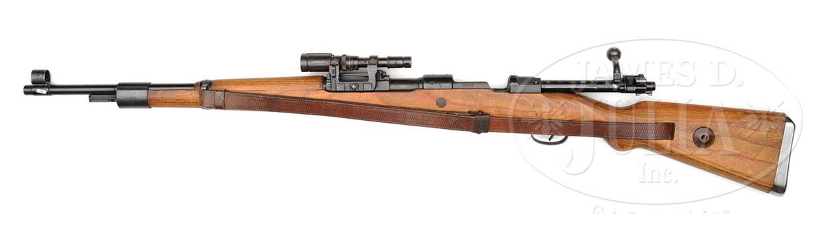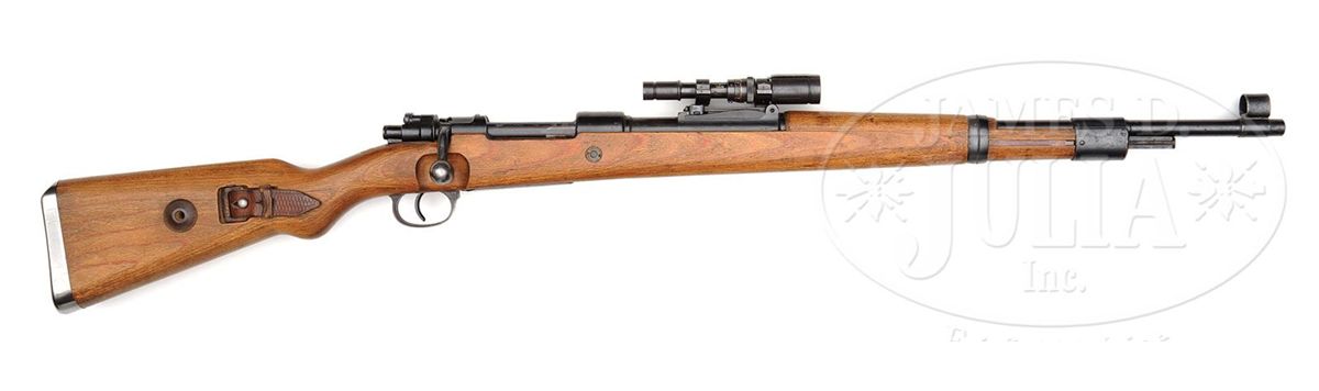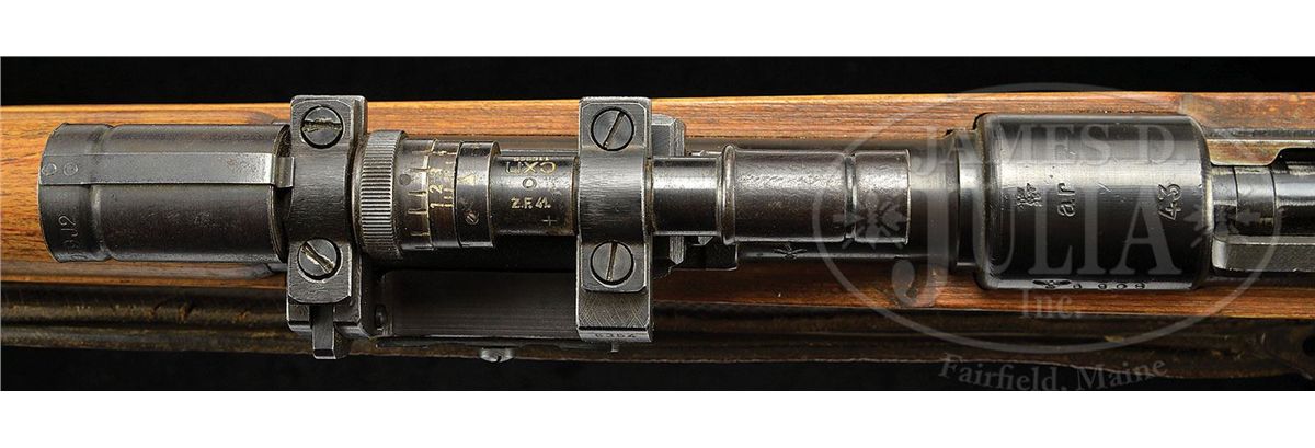 SN 6908d. Cal. 8mm. Authentic Zf41 K98k sniper rifle manufactured by Mauser-Borsigwalde. Factory installed Zf41 siderail base with blued receiver, top marked WaA 26, "ar43", produced in 1943. Front of receiver marked with Nazi era firing proof and SN 6908a. Trigger guard, front and rear bands match the weapon SN, remainder of parts are unnumbered. Left bbl marked with Nazi era firing proof and WaA 26. Zf41 scope is marked "cxn" (Emil Busch), SN 116885. Optics have three-piece reticle, and scope comes with easily lost front and rear rain shields. Authentic mount is serial numbered 6354c, WaA 214. Red glue laminate stock is unmarked. Comes with authentic serviceable "L&F" marked leather sling as well as an authentic sight hood. Mechanically fine and nice appearing Zf41 sniper rifle. PROVENANCE: Collection of Dr. Geoffrey Sturgess. CONDITION: Very good to excellent. Scope is very good, optics are fairly clear. Bore is very good to excellent. Stock is very good with scattered handling marks and scratches. 4-53269 DW40