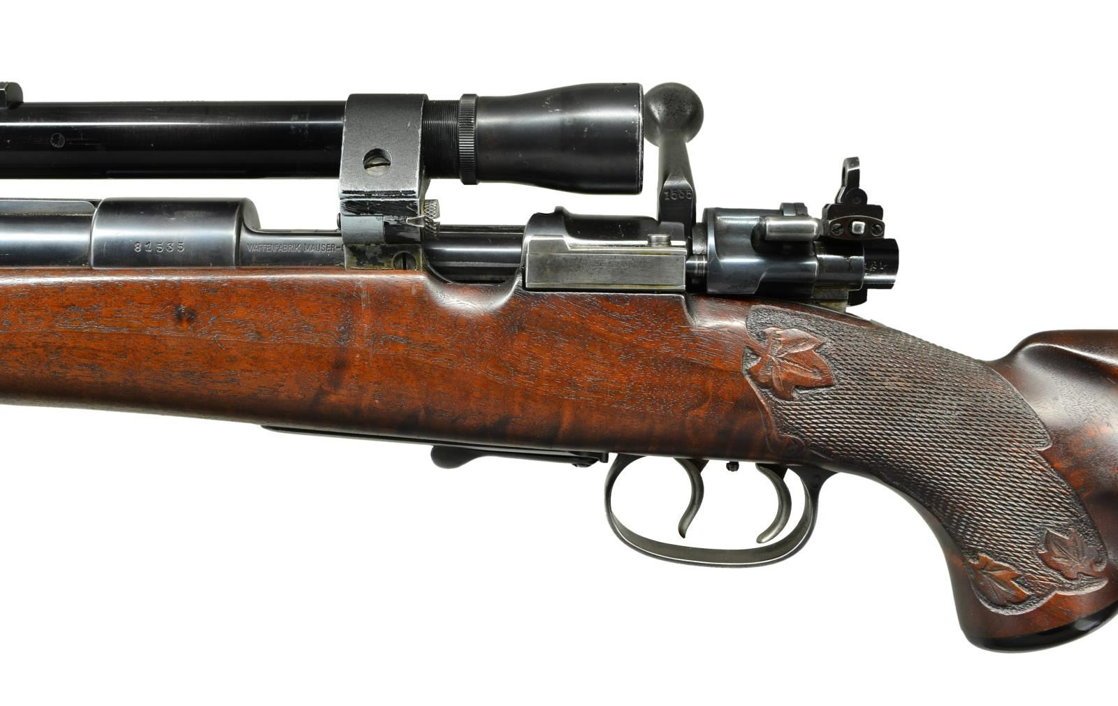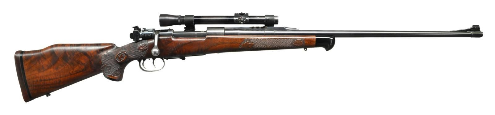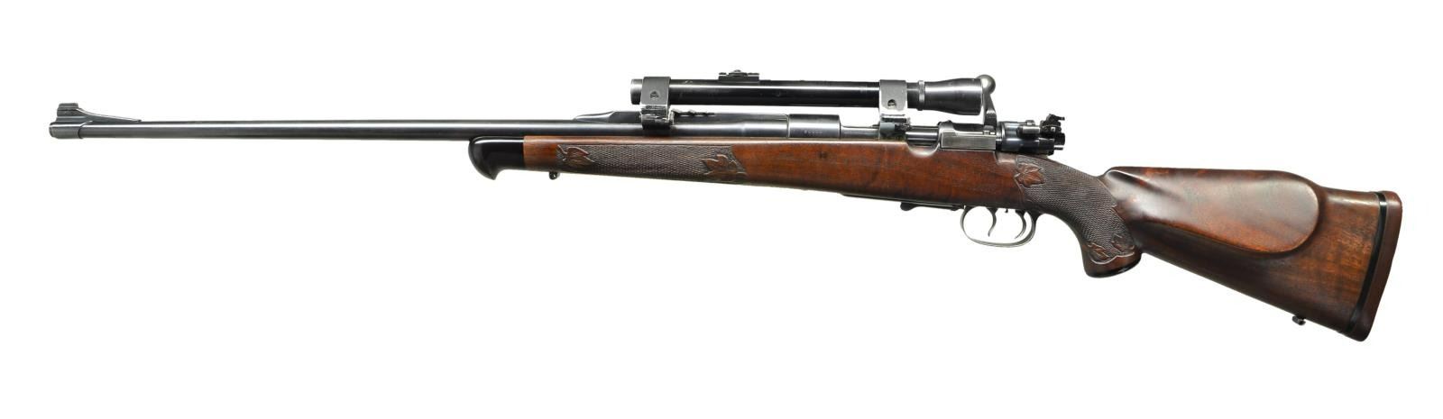 PACHMAYR. Cal. 7mm. (7x57 ?) S# 81535. The 26" medium weight round barrel is fitted with quarter rib with stippled top holding three folding leaf rear sight. Rib partially covers sleeved on band for Pachmayr lo-swing type scope mount. Banded on front ramp holds gold sourdough bead. No markings are noted on barrel. Standard length model 98 commercial Mauser action has rear portion of lo-swing mount added over usual factory markings. Matching bolt with pear shaped knob has had shroud fitted with scarce Pachmayr ghost ring/U-notch rear sight number "121" with windage and elevation adjustments. Staff is engraved "A.M. PACHMAYR" "Los Angeles, Cal" within rectangular device. Original bottom metal is fitted with set triggers and has lever type release for hinged floor plate. Capped pistol grip stock of crotch figured American walnut measures 13 1/2" over solid "NOSHOC" pad. Stock features Monte Carlo comb with Keith design swept right hand cheekpiece, deeply schnabled hard rubber forend tip and sling eyes. Checkered panels at forend and top of grip have flanking carved leaves. Right side of grip is carved with the initial "K" on raised oval pedestal which serves as a palm swell as seen on many rifles custom made for Elmer Keith. Scope mounts are fitted with Lyman "ALASKAN" 2.5 x scope with crosshair and post reticle in lo-swing type rings which are unmarked and possible prototypes. CONDITION: fine. Metal parts retaining over 80% of what appears to be their original blue which has browned considerably on bottom metal. Stock retains what appears to be its original oil finish with some scattered marks. Bores bright and shiny. Mechanically good. Scope shows many marks on exterior, optically good. Mounts show considerable loss of lacquer. An interesting rifle owned by an iconic gun writer. (22-5815/MGM). CURIO. $2,000-4,000.