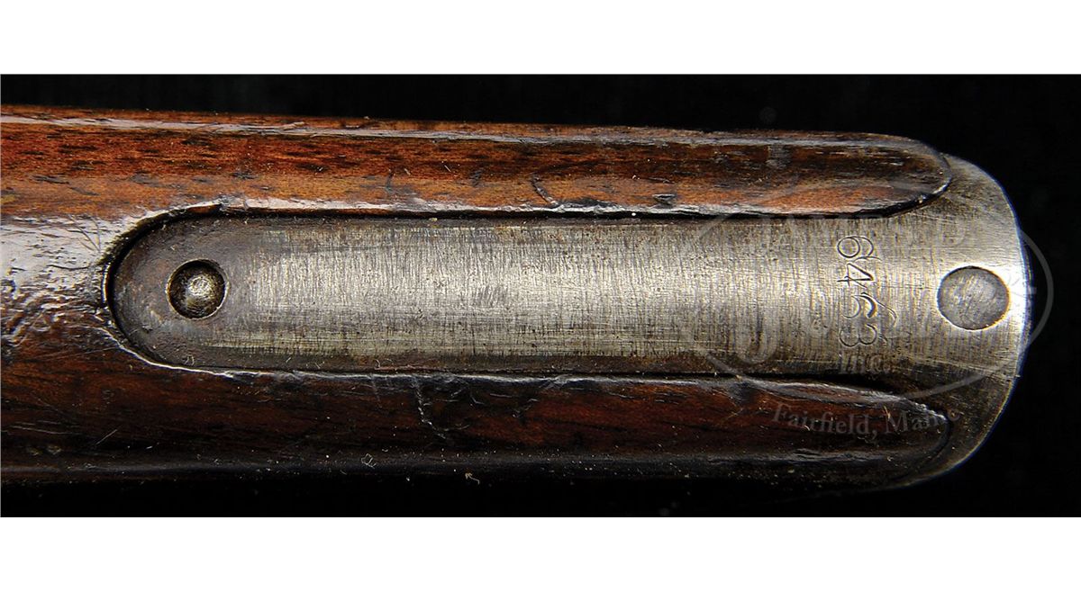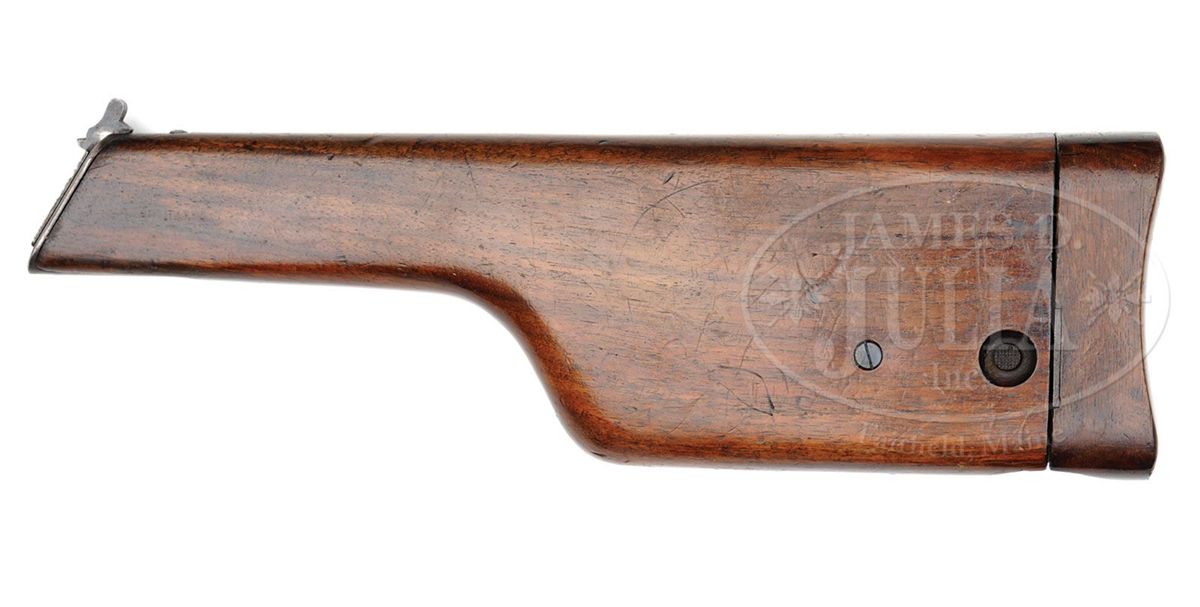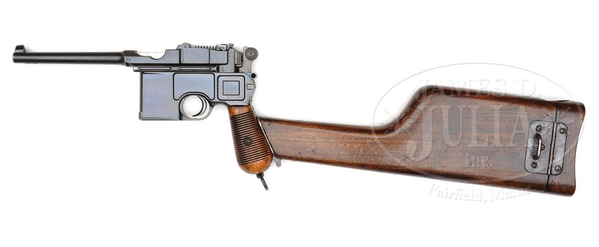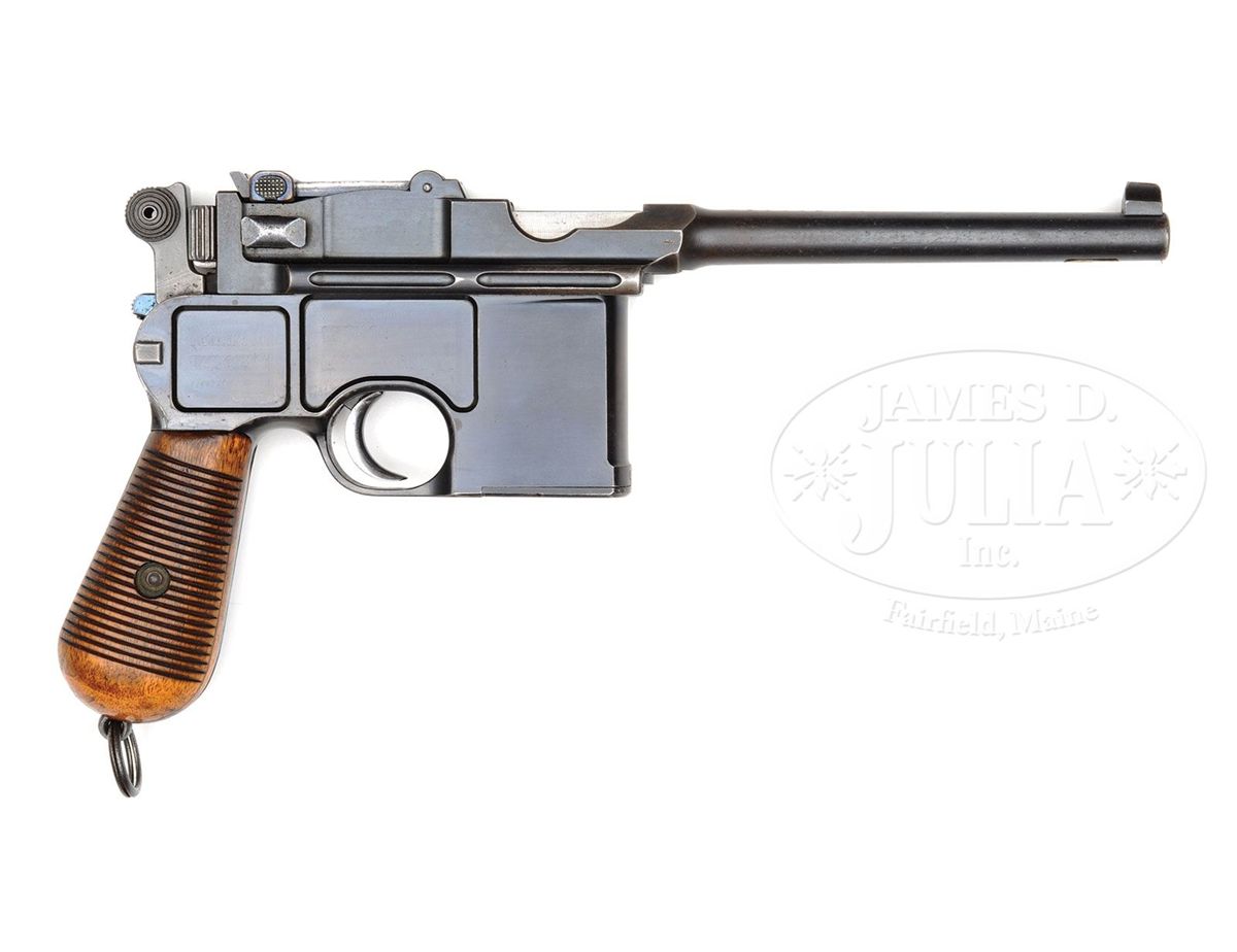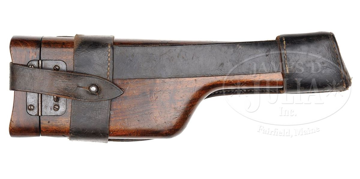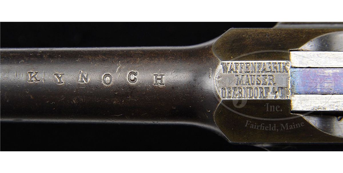 SN 6463. Caliber: 7.63mm. Standard mid-production Conehammer with 5.5” bbl and pinned 50-500 rear sight. Standard chamber address with Crown-U marking on left side of barrel extension; antler proof on right side. Long extractor, independently secured firing pin. Full serial number on back of hammer and on frame below locking lever. “KYNOCH” stamped on top of barrel. This marking was commonly applied to the guns in Kynoch’s in-house collection kept for ammunition load development and proof firing of production ammunition for functioning. Fire blued extractor, sight assembly, bolt stop, safety and grip screw. Trigger is in the white as is correct. Limited disassembly disclosed a mismatched floorplate. Correct wood grips and lanyard ring. Accompanied by later Mauser stock, in a commercial carrier, having two cutouts in the lid for the safety and a force-matched lug. PROVENANCE: Collection of Dr. Geoffrey Sturgess. CONDITION: 95% bright original blue with darker floorplate. Comparable condition fire blue on the small parts. Grips are blonde and retain most of their original varnish. Perfect mechanics. Later production stock is condition-appropriate with some oil staining and handling marks. Hinge with expected oxidative changes, cleaned and renumbered lug. Carrier is dark from oil and aging. 4-53291