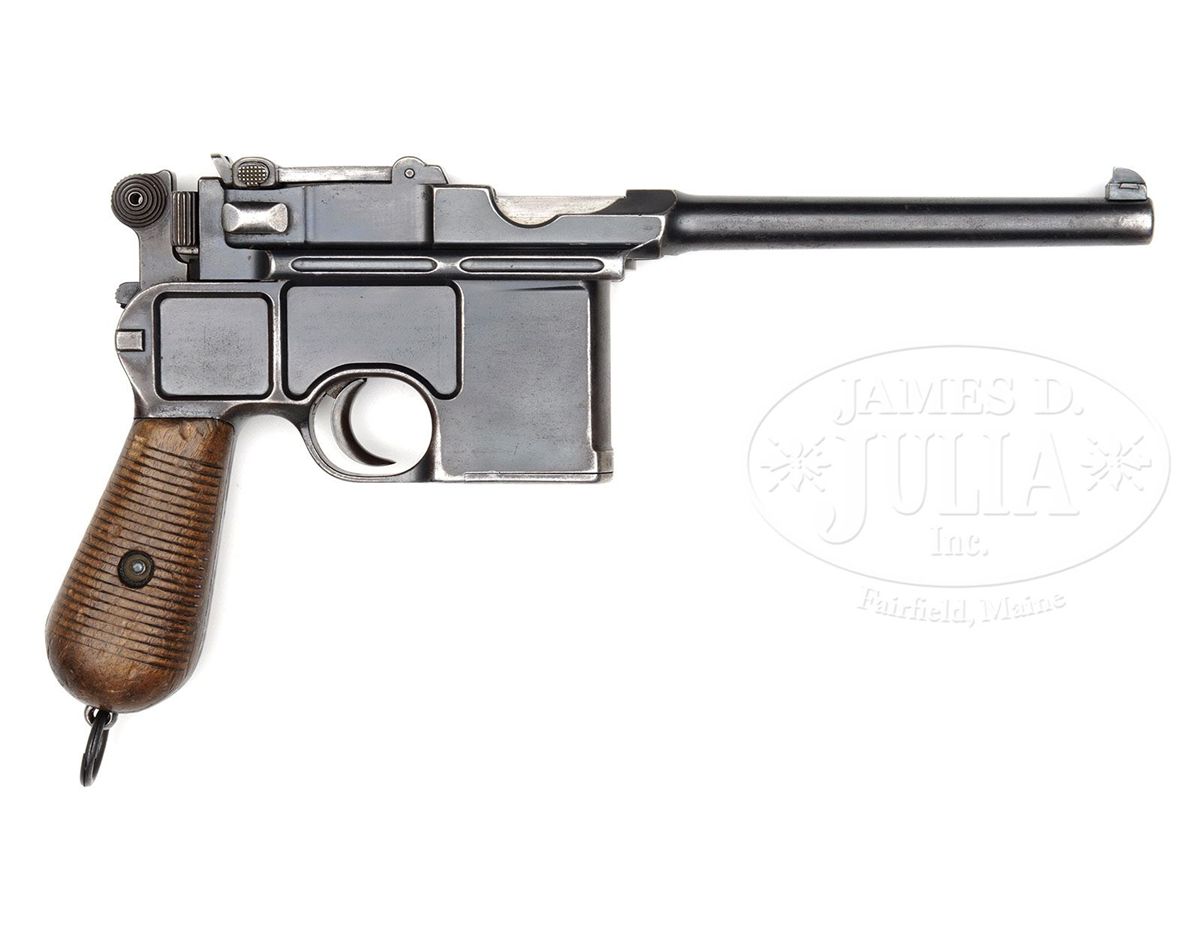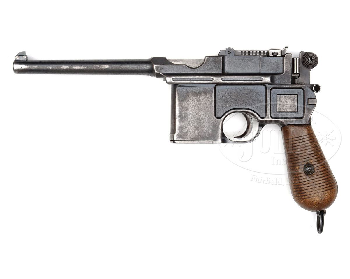SN 8387. Caliber 7.63mm. Mid-range production Conehammer with 5.5" bbl, Crown U marking on left bbl extension and antler proof on right side. Front sight modified to include a separate patridge-type insert. Pinned 50-500 rear sight. Early bolt with separate firing pin retainer. Ten shot example slotted for shoulder stock. This particular gun was made for Mexico as denoted by the R.M. (Republica Mexicano) as stamped just above the stock slot. All matching (including firing pin) except for grips, each panel numbered 13884. PROVENANCE: Joseph J. Schroeder, Jr. Collection. CONDITION: Very few Mexican contract Conehammers escaped being buffed and reblued. Though this example has moderate oxidation as reflected by superficial patina, the remaining finish, roughly estimated as 50%, is original. Condition of grips is consistent with the gun and they were originally fitted to a C96 of the same era. Bright bore with shallow rifling and oxidation from corrosive ammunition. Perfect mechanics. A seldom encountered variation, particularly in original condition. 4-48555 LMA2